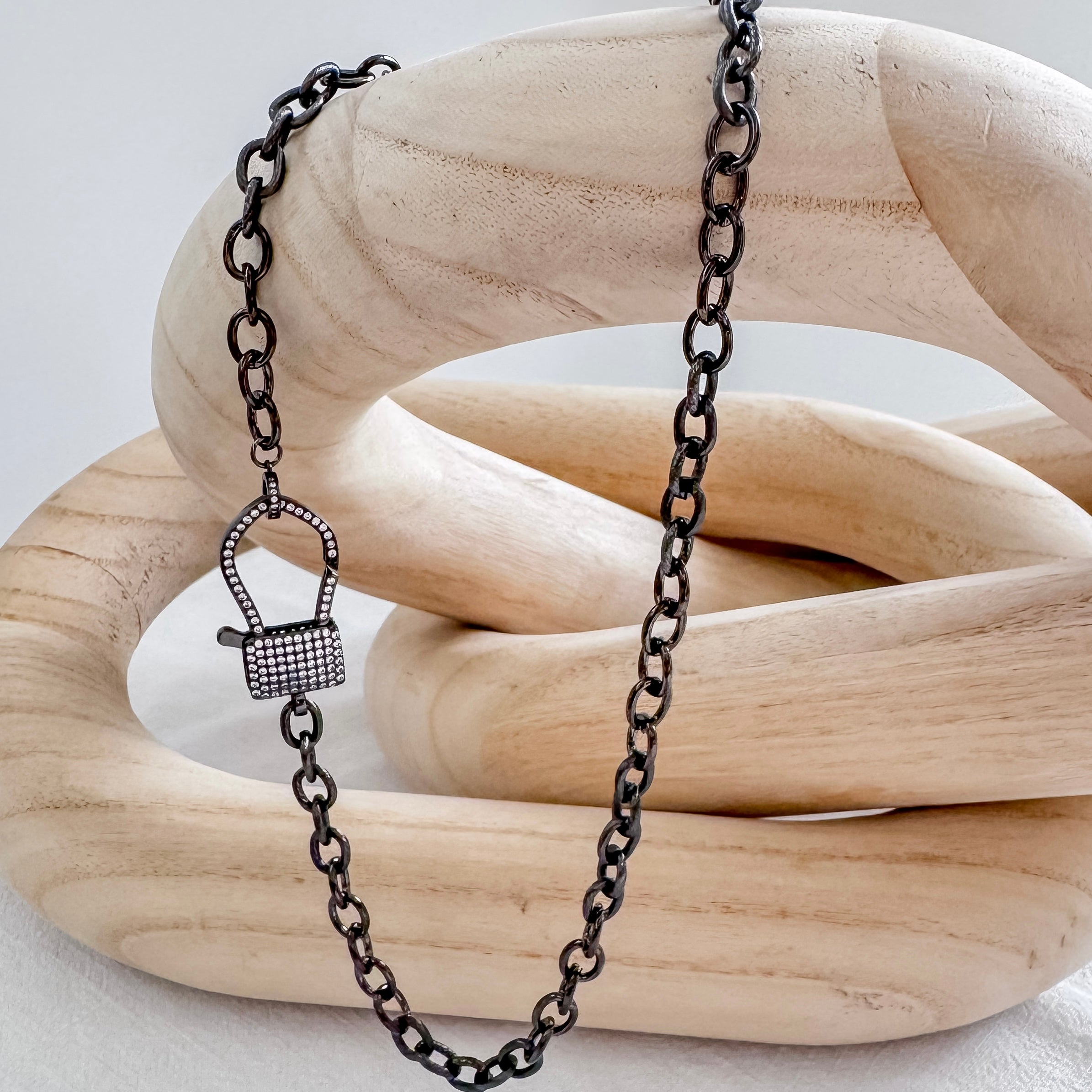 Edgy and modern, the Kiu Necklace features a bold black enamel chain with a pavé lock clasp. Perfect for layering or making a fearless solo statement.