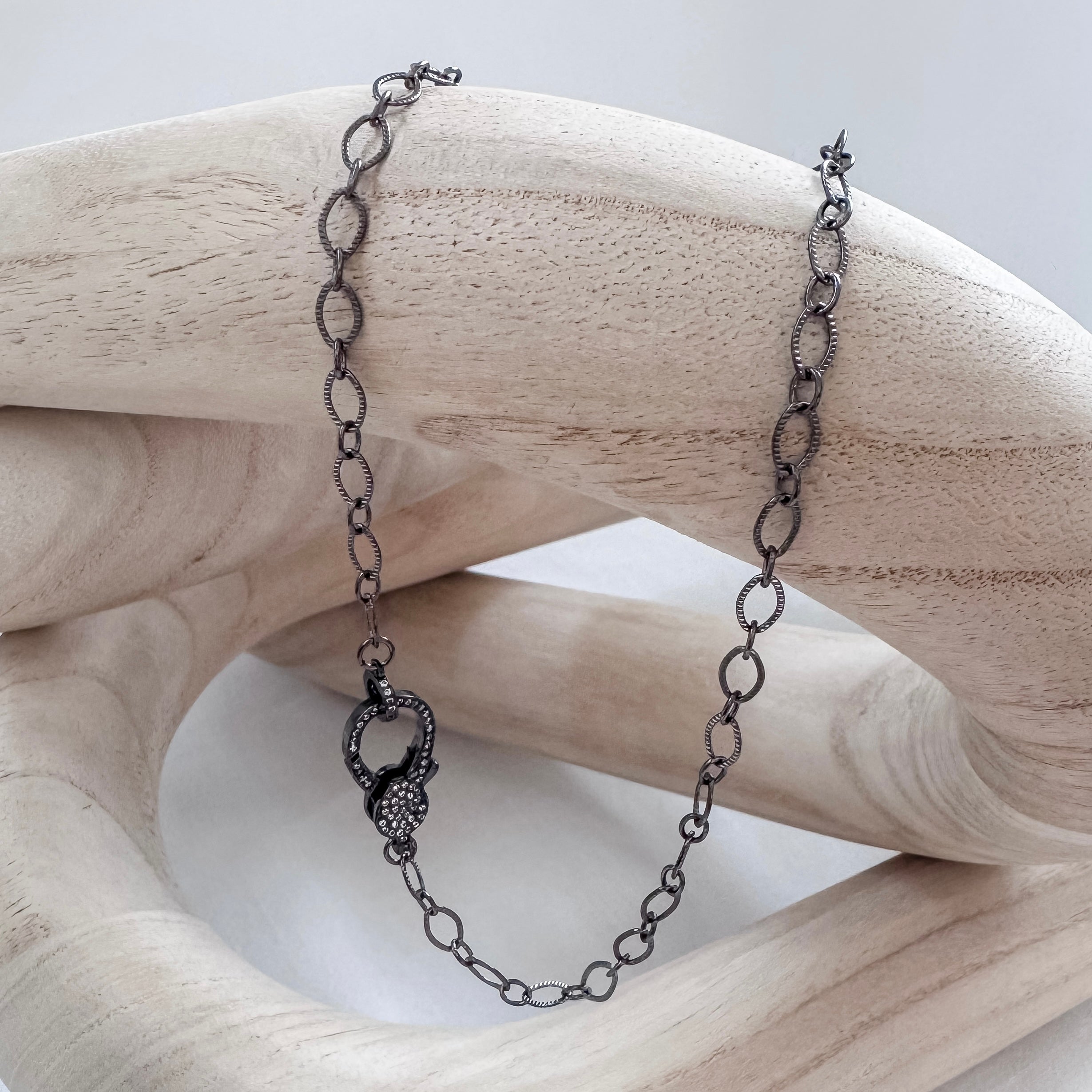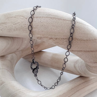 The Noda Necklace brings a sleek black enamel chain finished with a crystal clasp — a subtle yet striking detail for your everyday looks.