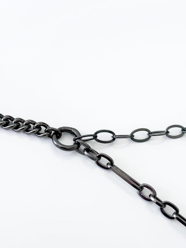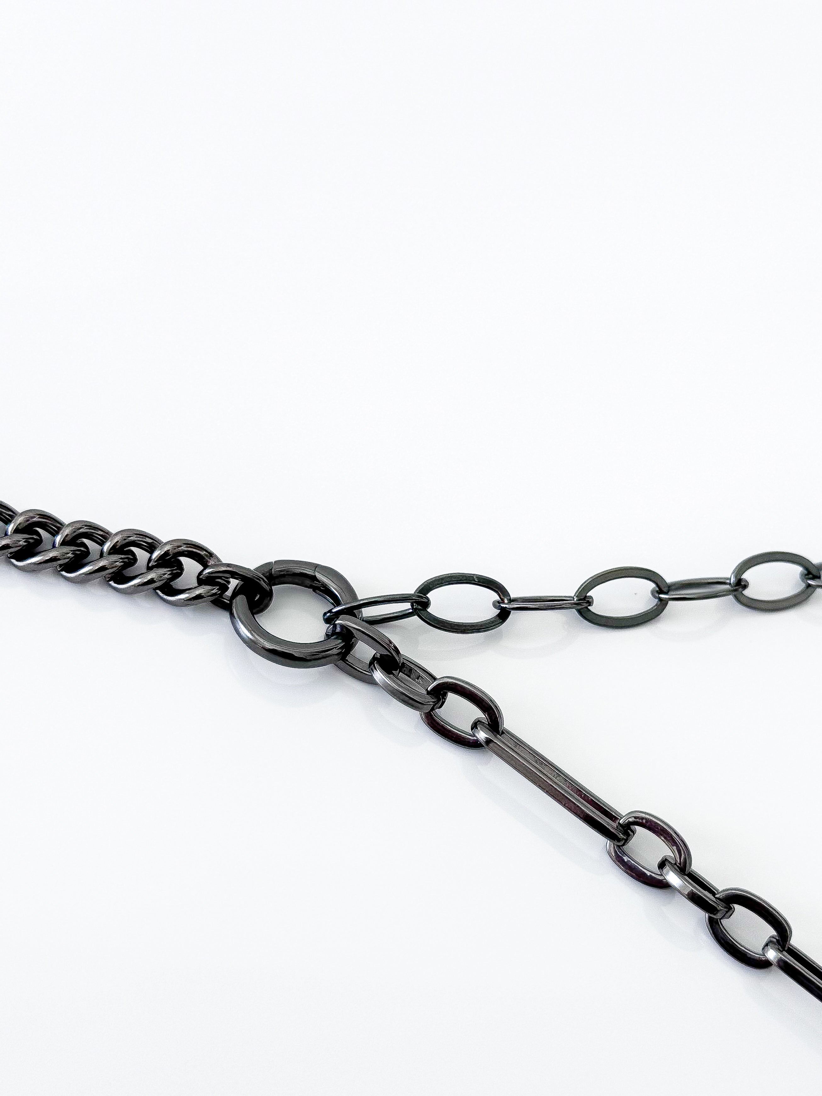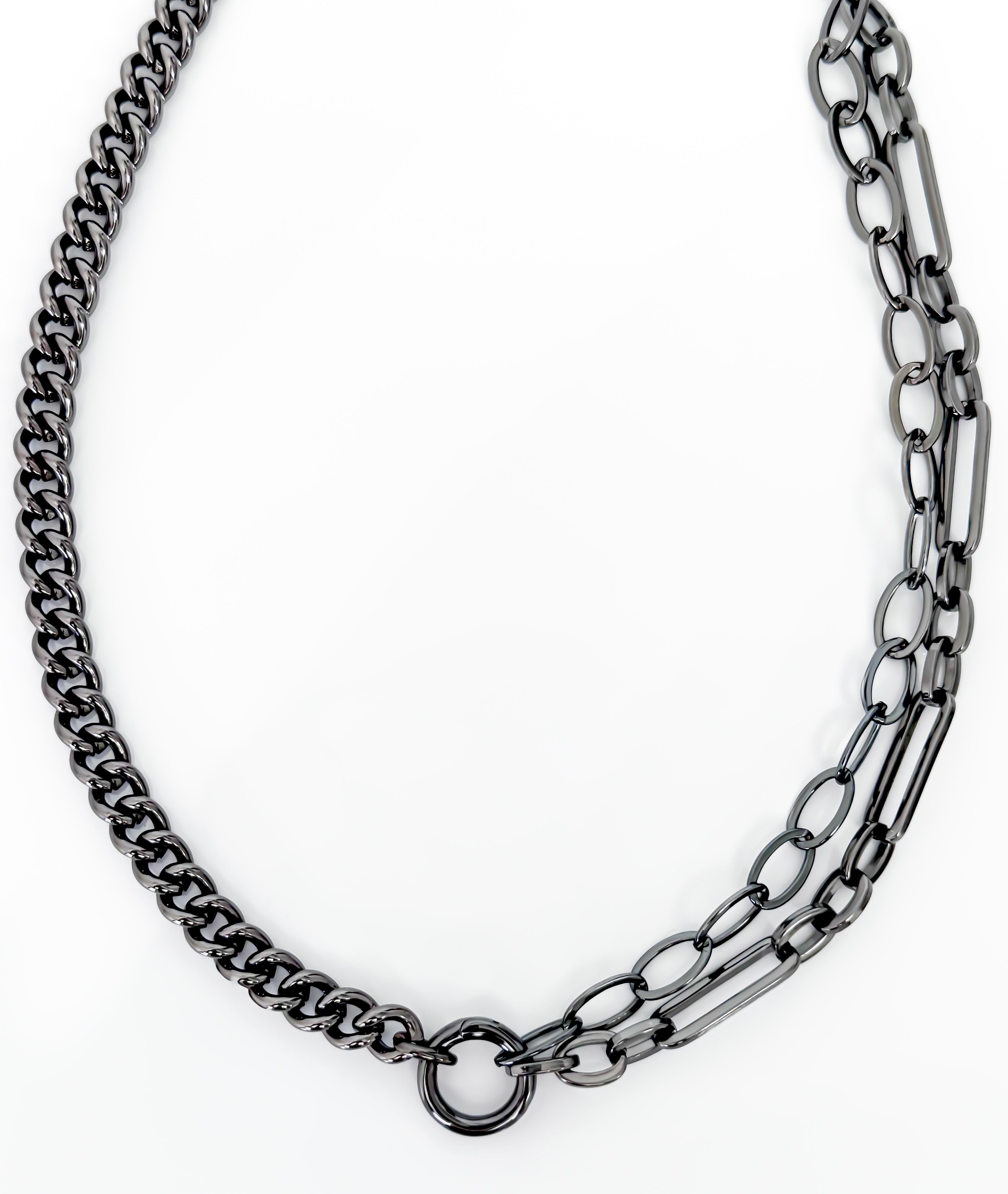 A bold dual black enamel chain designed to stand out. The Plams Necklace mixes chunky and sleek links for a modern statement look with edge.