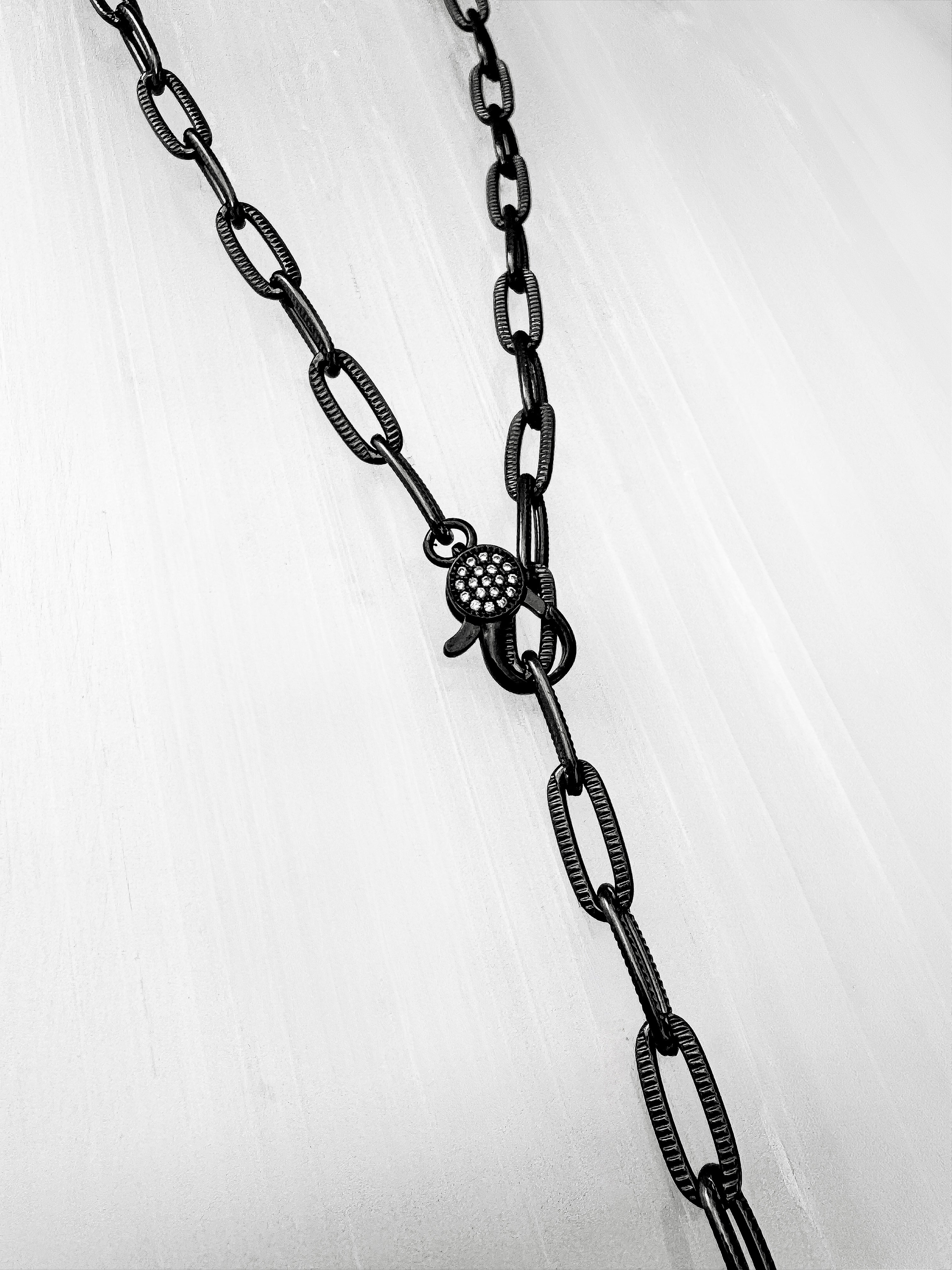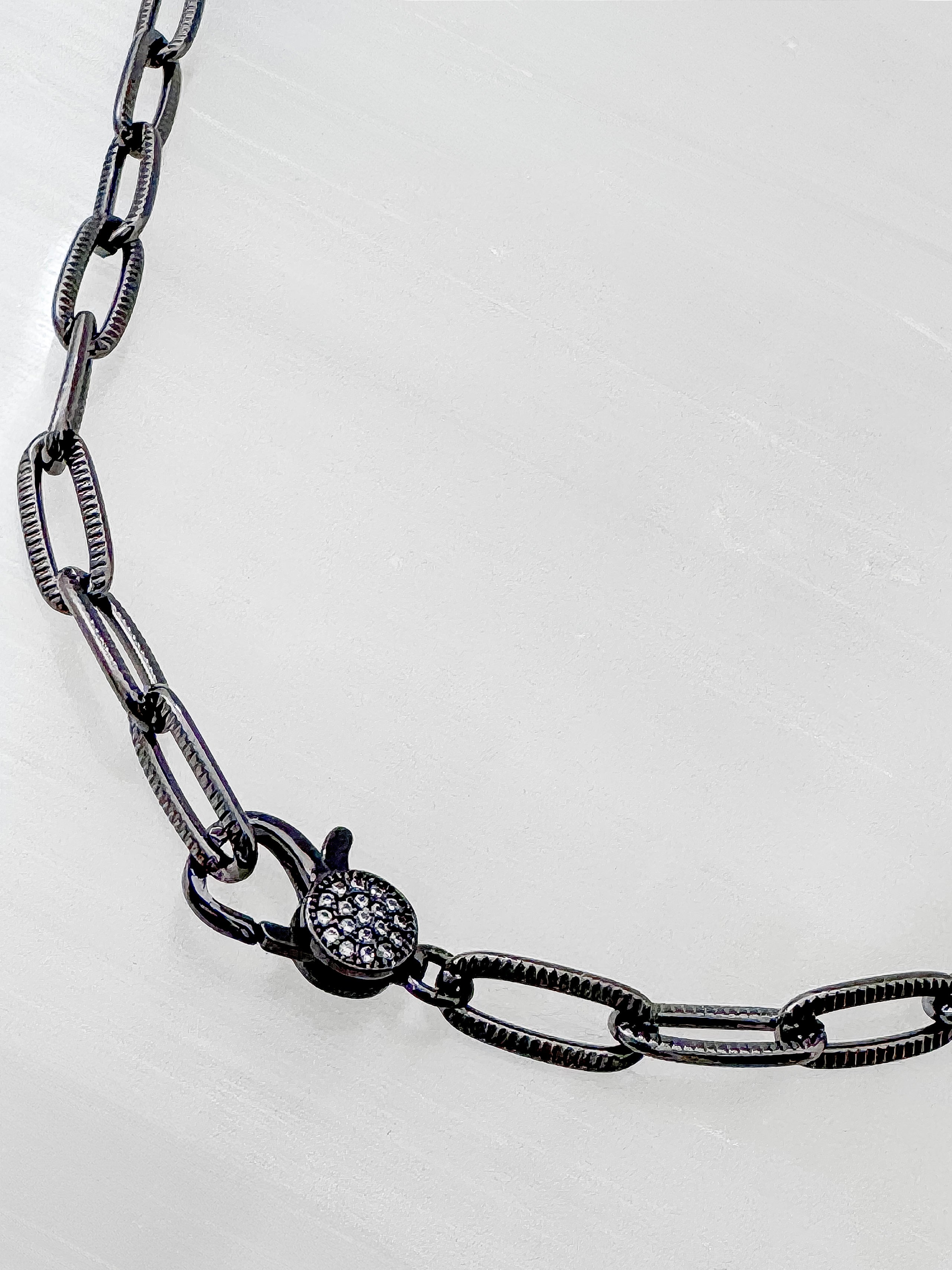 A sleek black enamel chain with a pavé clasp detail that elevates any look. The Seint Necklace is modern, edgy, and versatile for layering or wearing solo.