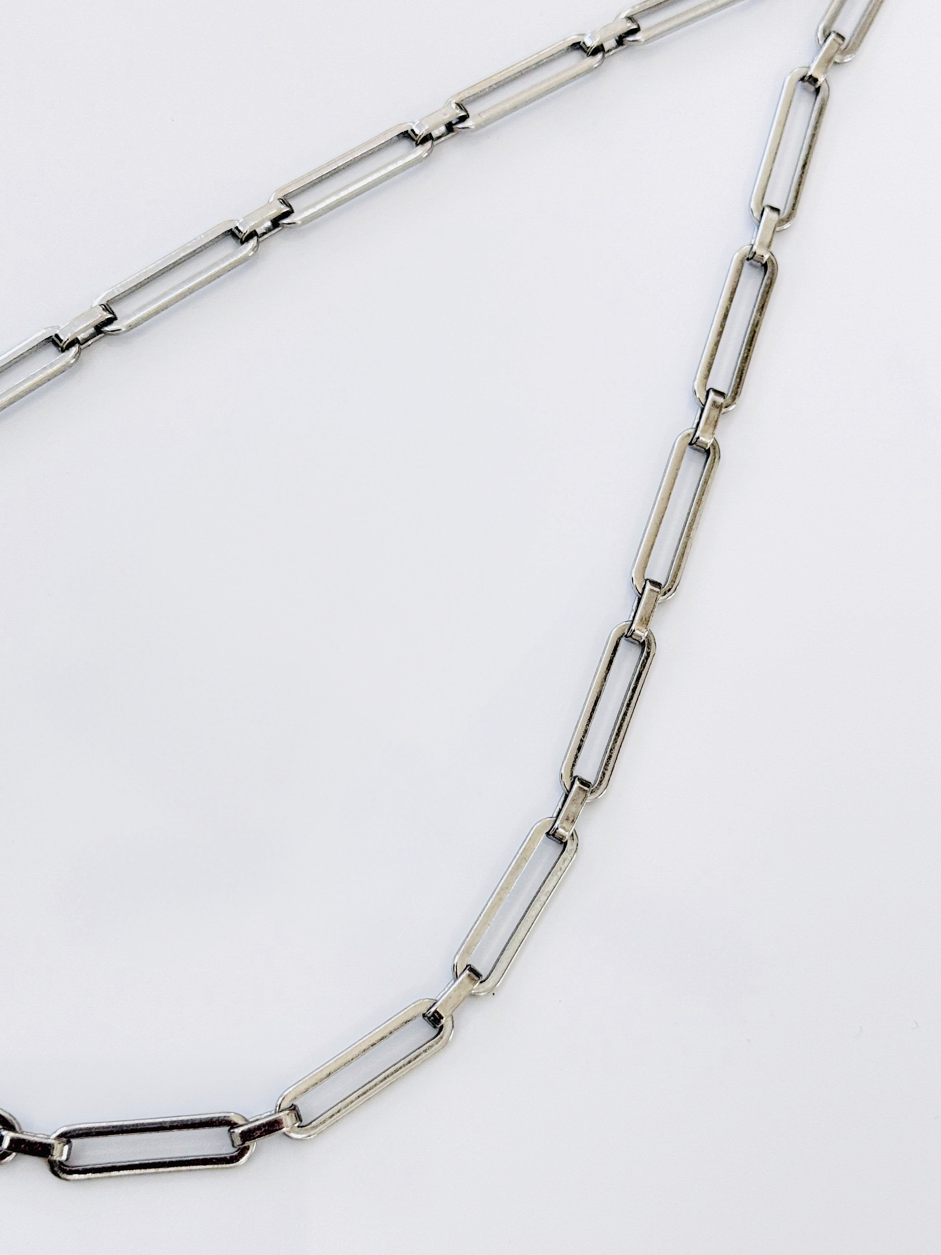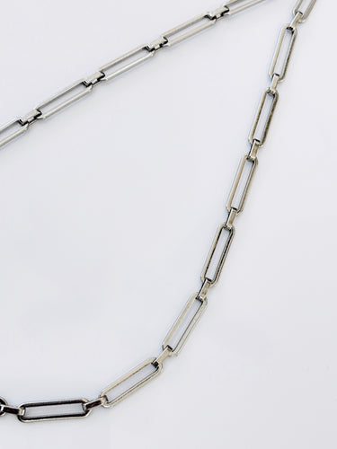 The Umi Necklace is a sleek silver chain with elongated rectangular links. Minimal and versatile, it adds a modern edge to layering or stands out on its own.