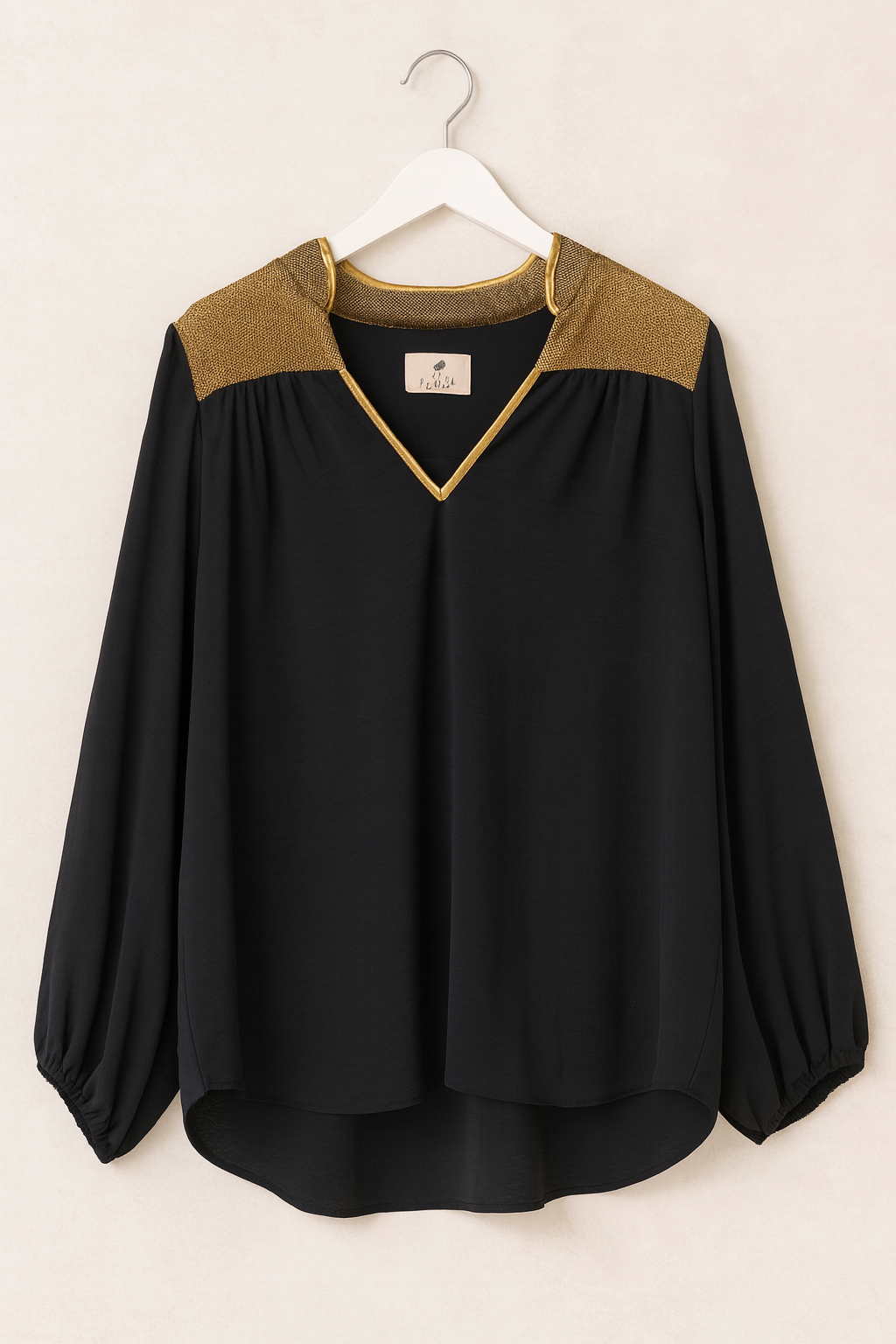 The Goldie Blouse is the definition of understated elegance. Featuring soft black fabric with gold shoulder panels and a delicate metallic neckline trim, it blends timeless design with modern edge. Flowy sleeves and a relaxed fit make it perfect for day-to-night transitions — polished, versatile, and effortlessly chic.