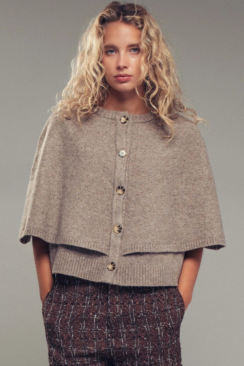 The definition of effortless chic. This knit cape cardigan blends comfort and sophistication — featuring a soft textured knit, relaxed drape, and oversized buttons. Perfect for layering over blouses or dresses. Runs slightly oversized for a modern, cozy look.