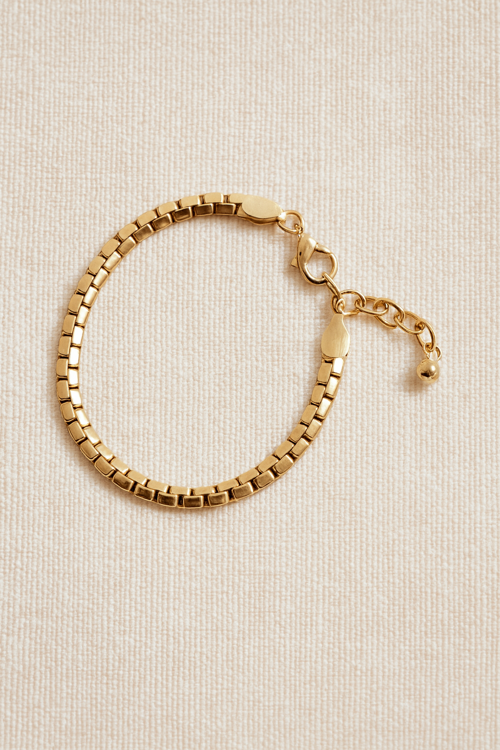 Refined and timeless — the Venetian Chain Bracelet adds effortless shine to your everyday look. Crafted with squared links and high-polish gold plating, it layers beautifully with bangles and cuffs or stands out on its own.