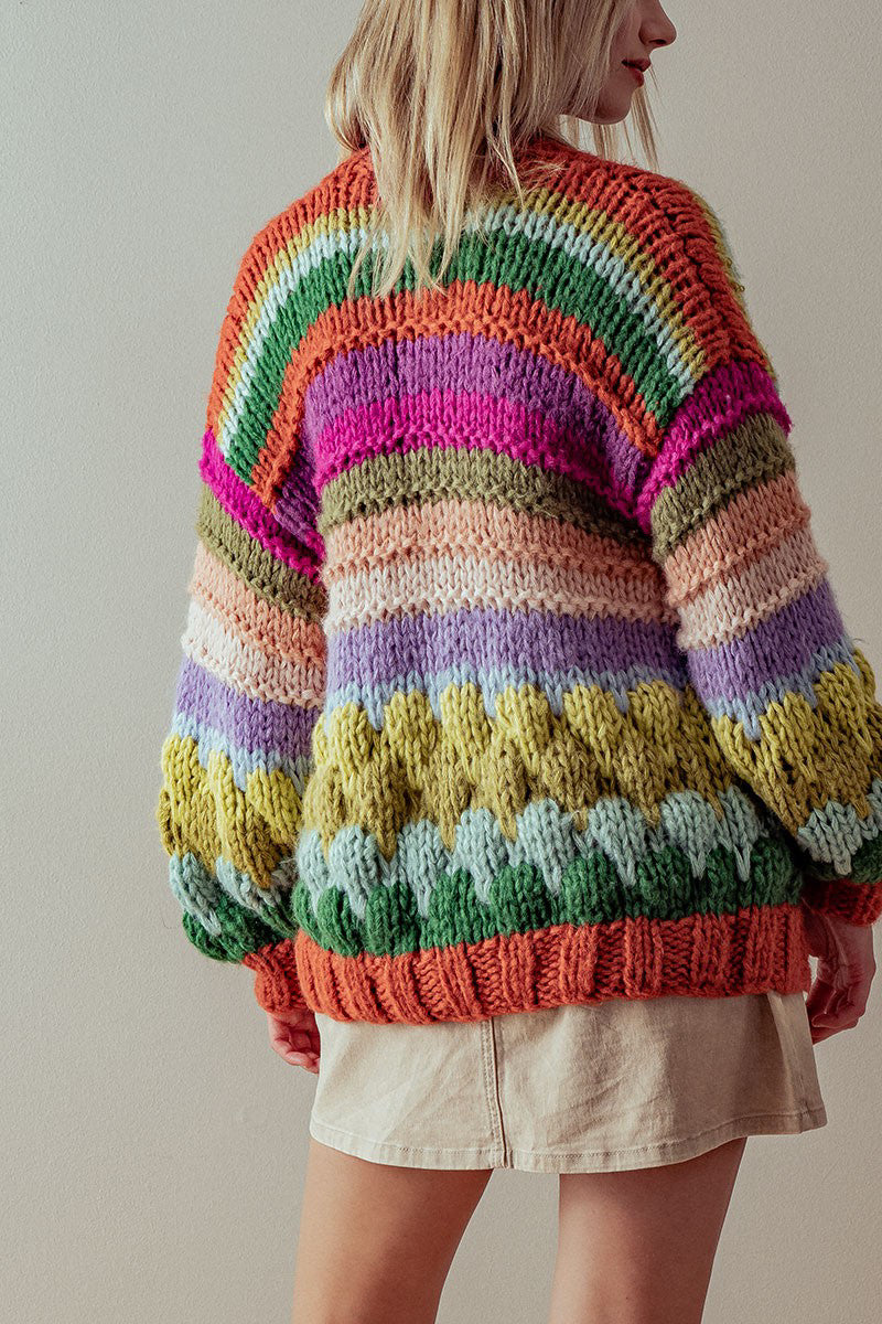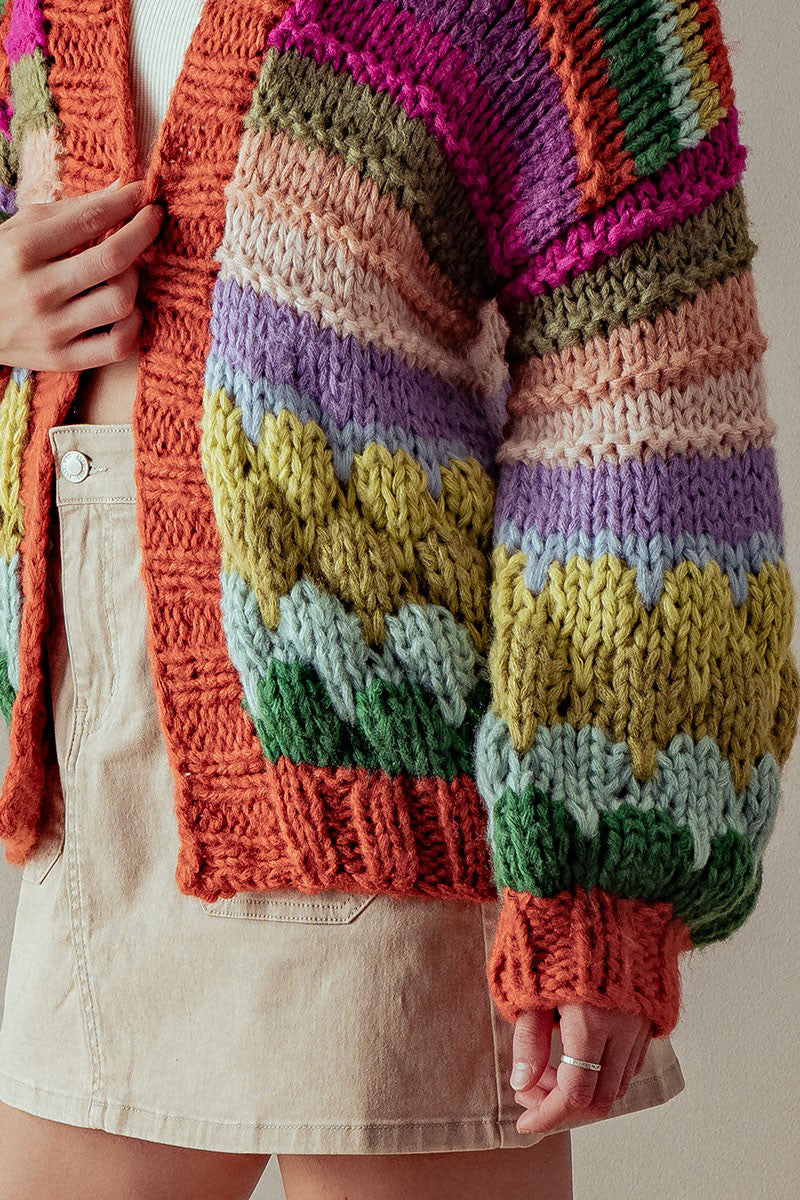Embark on a colorful adventure this season with our Goa Chunky Thread Sweater Cardigan! This chunky, handcrafted piece is like a hug you can wear, featuring a spectrum of warm hues that brighten up chilly days. It’s not just a cardigan; it’s a statement of joy and comfort, ideal for those crisp mornings or relaxing evenings at home.