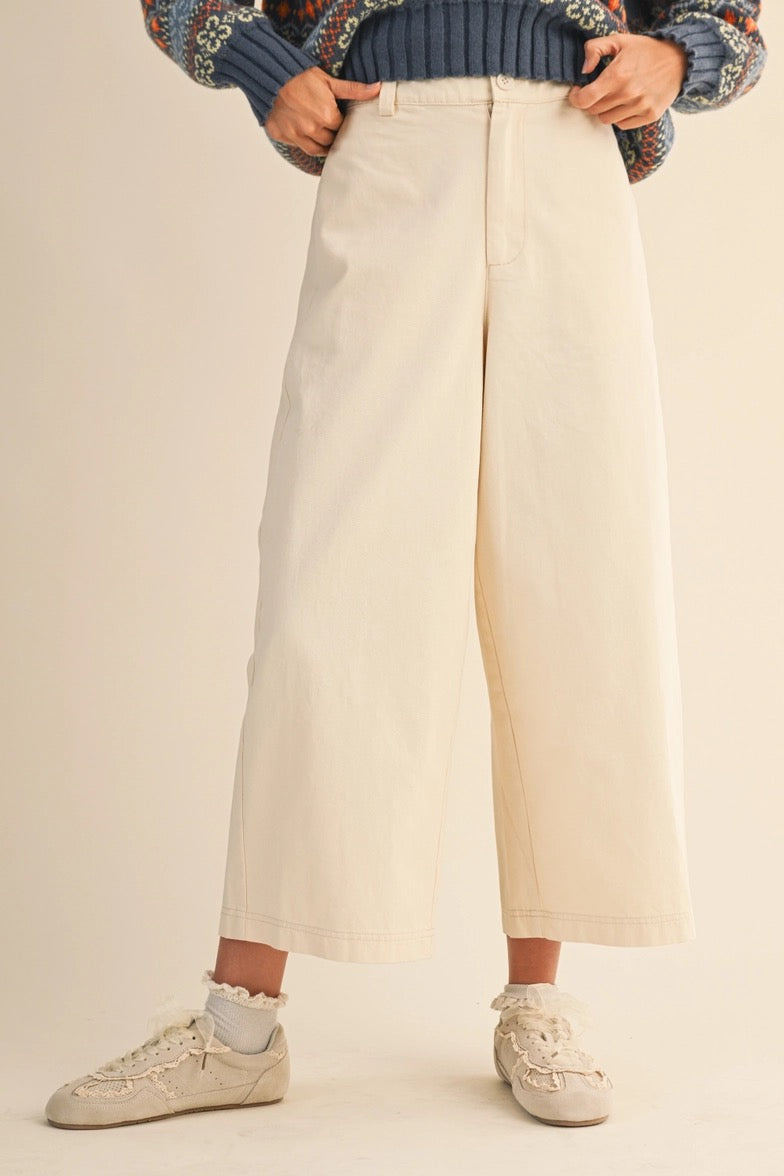 Relaxed wide-leg pants crafted in a soft olive-toned cotton fabric. Designed with a high-rise waist, clean front, and an easy cropped length for effortless everyday wear. Functional yet refined, they offer comfort, structure, and timeless appeal.