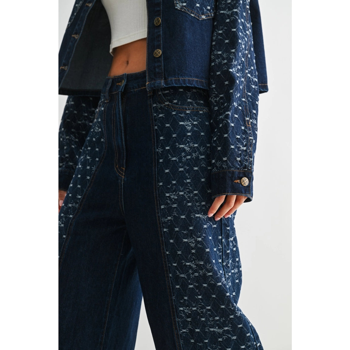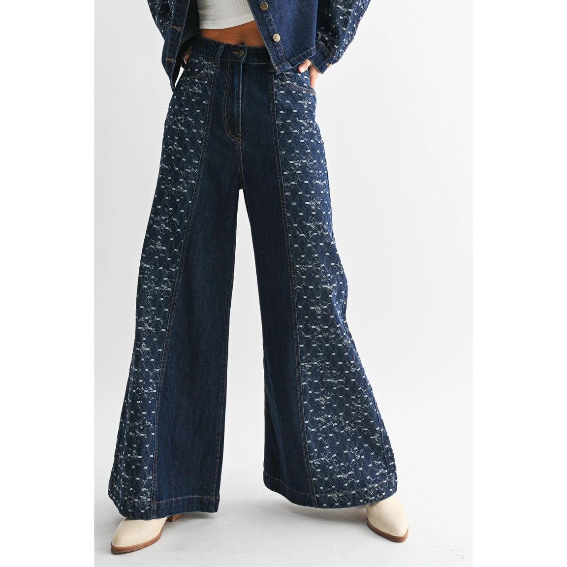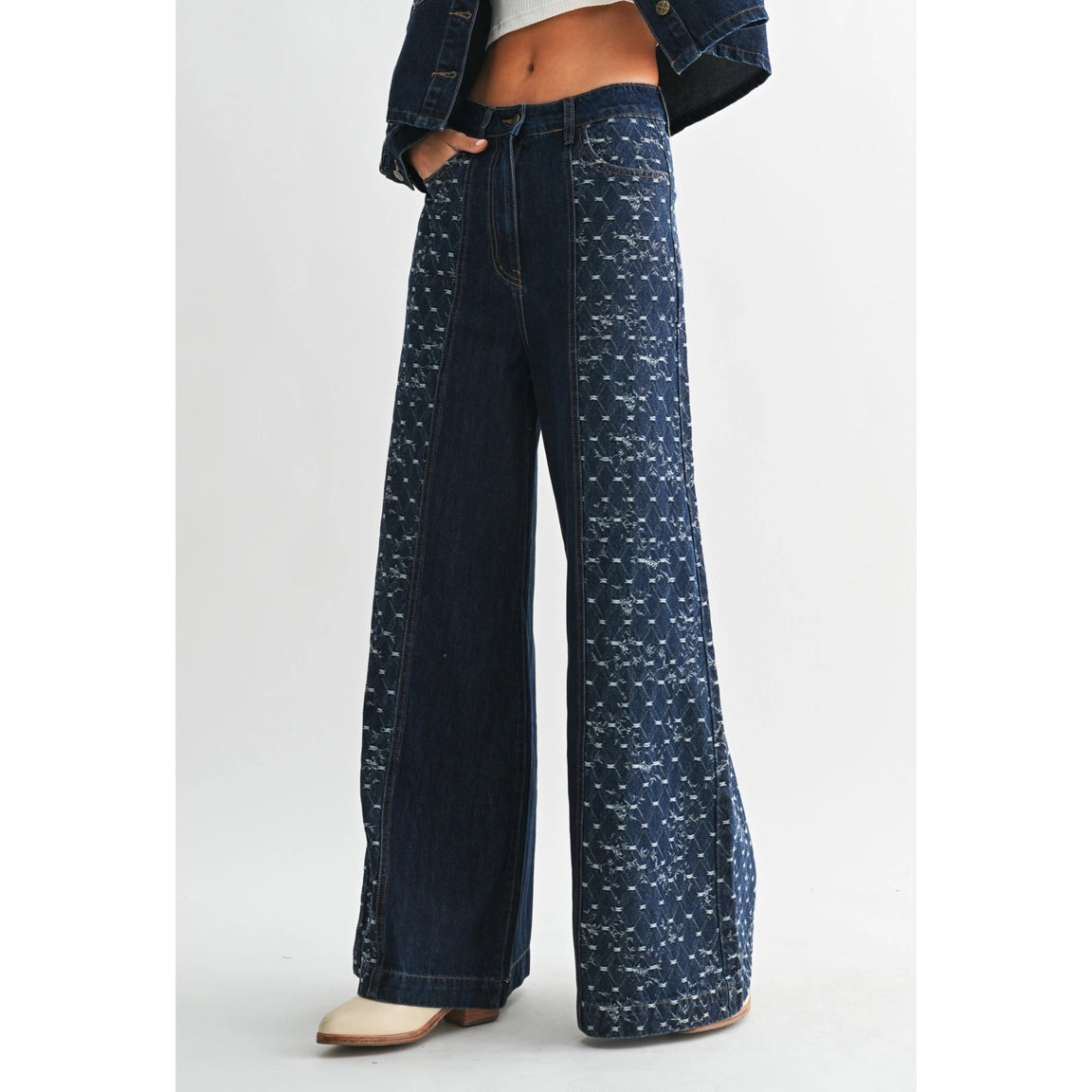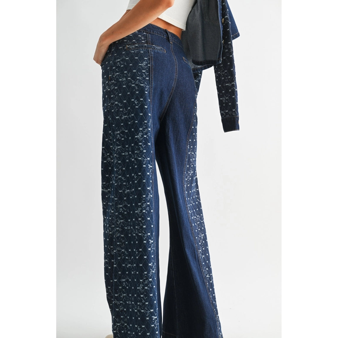 Wide-leg jeans in a dark indigo wash, featuring subtle patterned side panels for a refined, artisanal touch. Designed with a high-rise fit and a relaxed silhouette that flows effortlessly from waist to hem.
