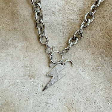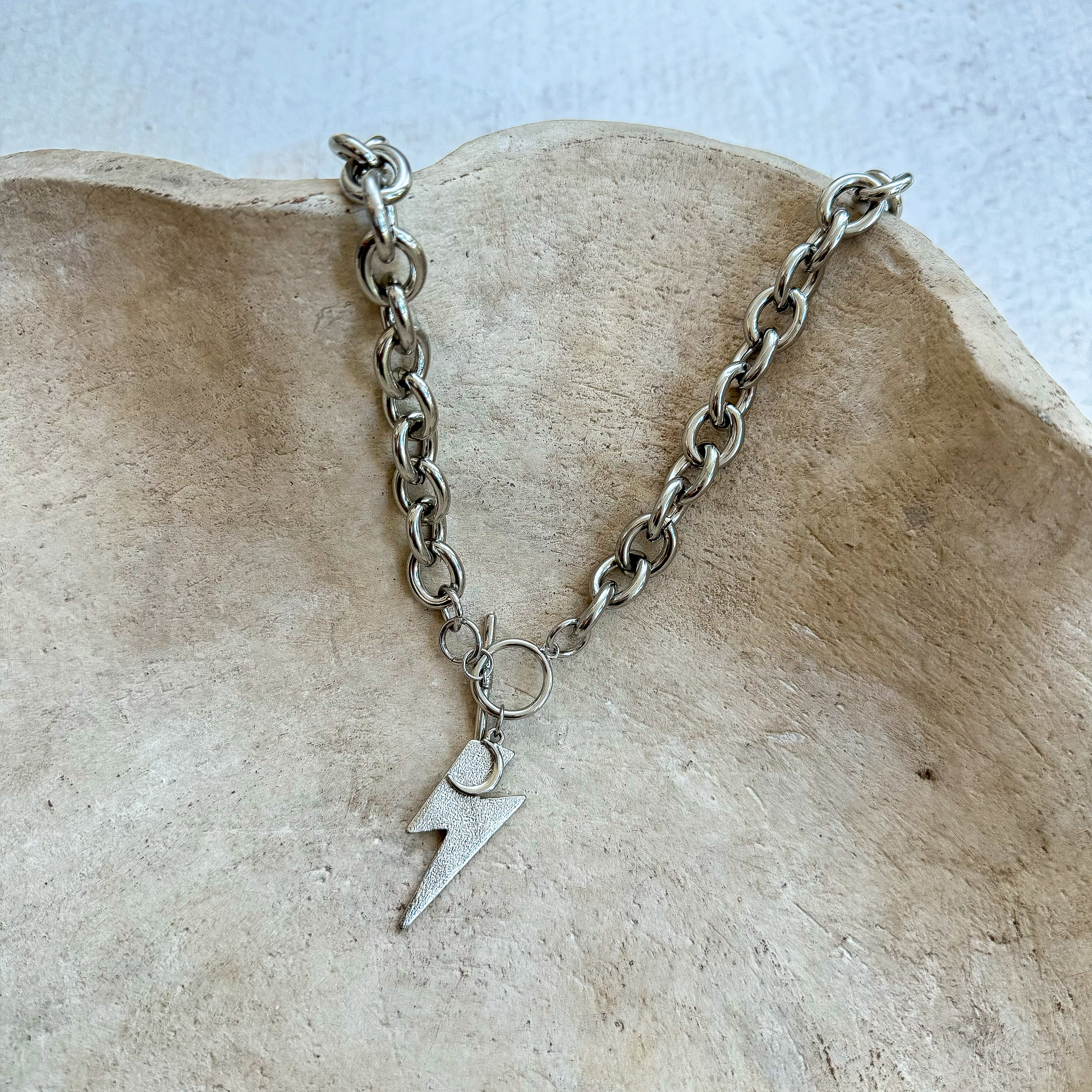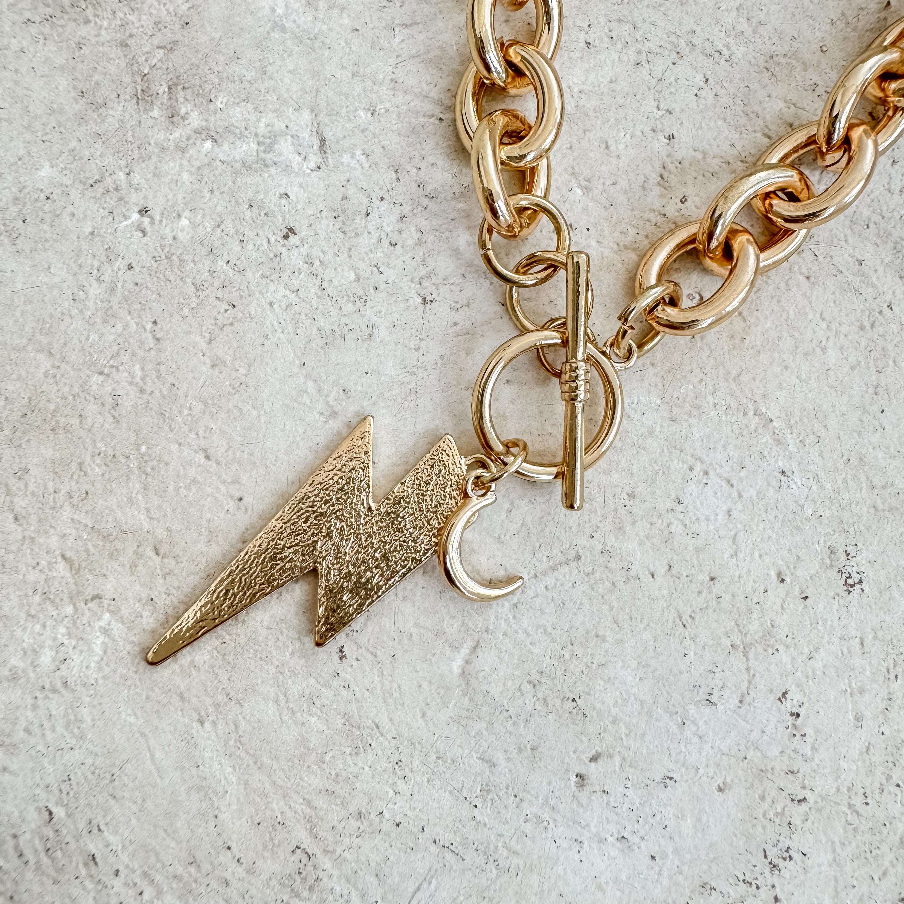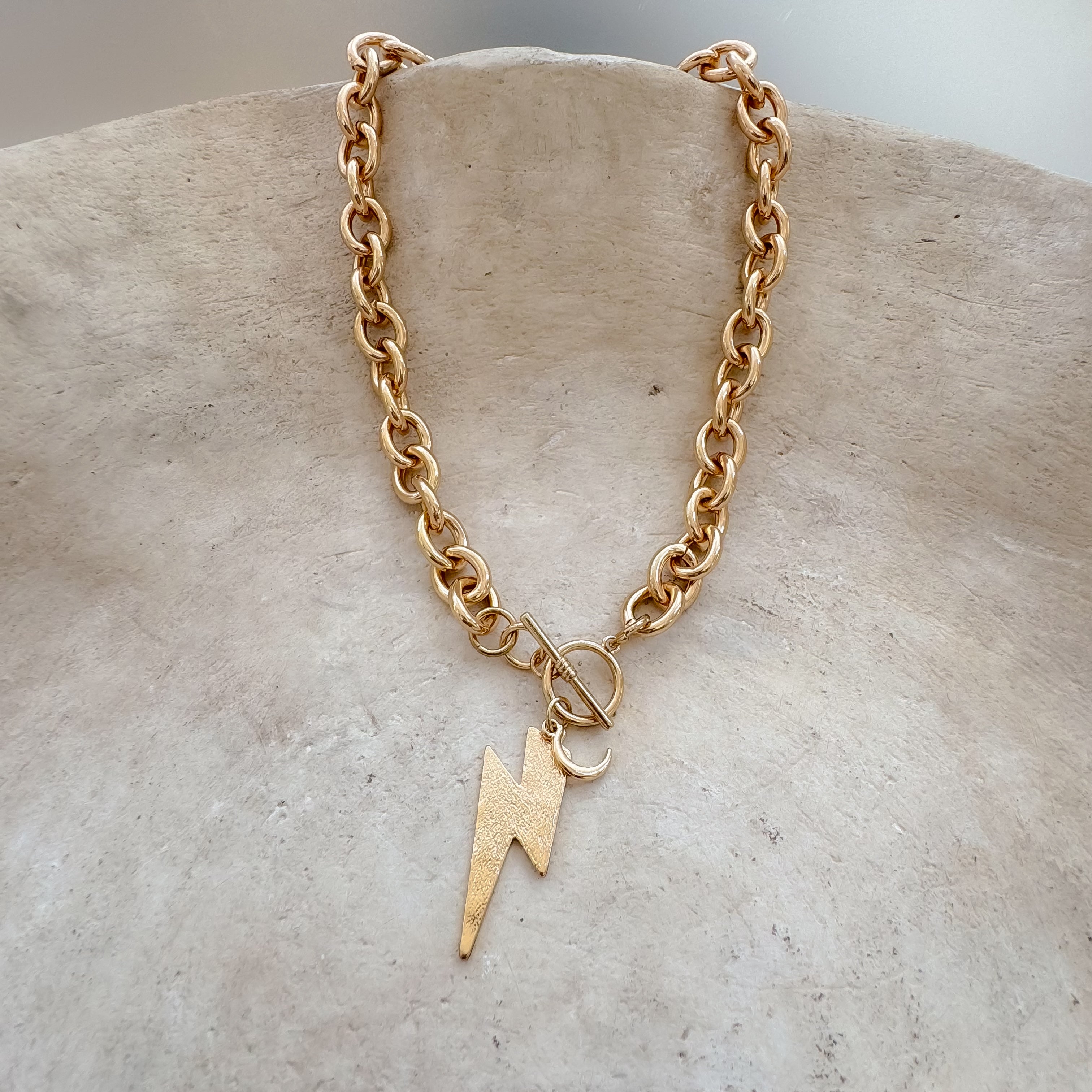Bold and edgy, the Rodda Necklace features a chunky chain with a lightning bolt pendant. Gold plated with modern detail, perfect for statement styling.