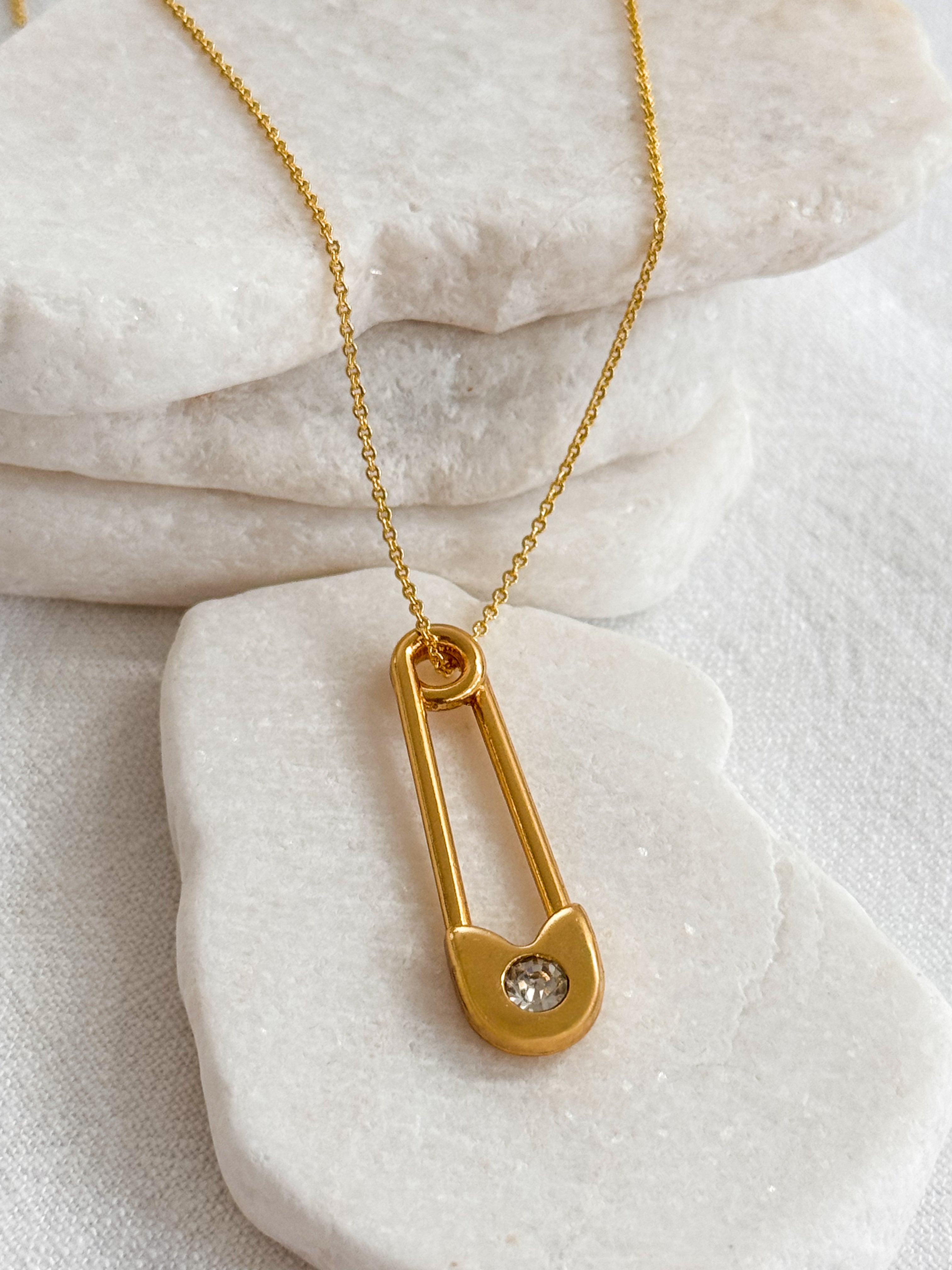 Edgy meets chic — the Safety Pin Necklace reinvents an everyday icon into a modern statement. Crafted in gold plating with a sparkling crystal detail, it’s lightweight, hypoallergenic, and designed to stand out. Whether worn solo for a bold touch or layered with delicate chains, this piece brings playful energy and style to any outfit.