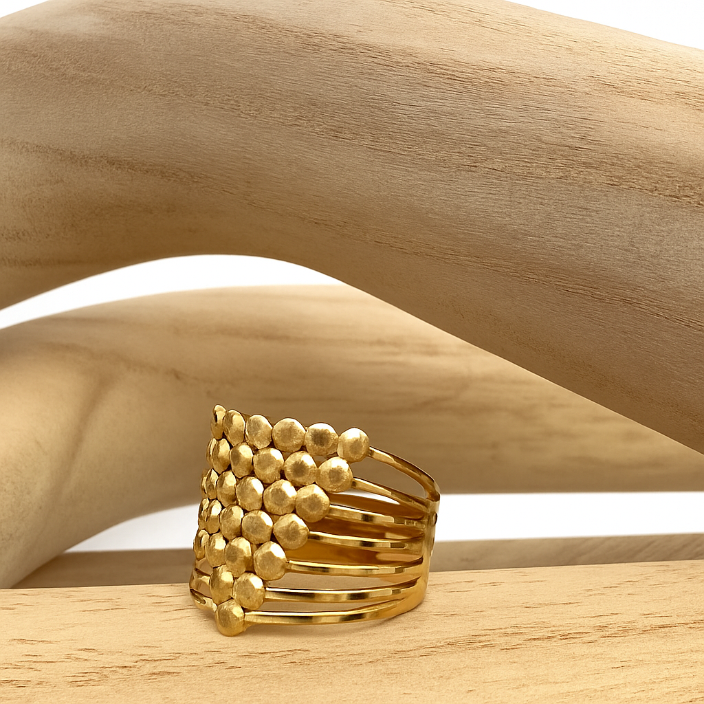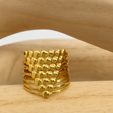 Bold yet refined — the Jordana Ring showcases a cascading beaded design in high-shine gold plating. A statement piece that catches the light beautifully, adding a sculptural edge to any look.