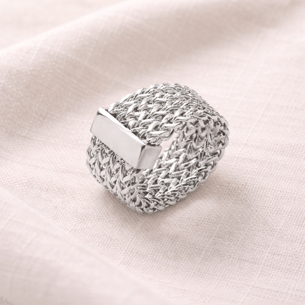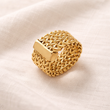 A bold statement ring crafted from interwoven gold-toned chains with a sleek central bar detail. Its sculptural design blends strength and elegance, making it the perfect piece to elevate both everyday looks and evening styling.