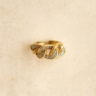Radiant and refined — this gold-plated braided ring shimmers with crystal baguette accents for effortless shine from day to night