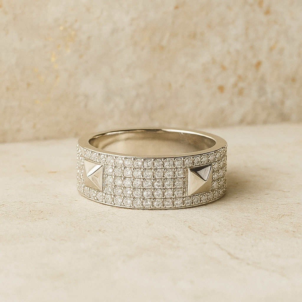 A modern sparkle with a bold twist — this silver band shines with pavé-set crystals and sleek pyramid studs that catch the light from every angle. Elegant yet edgy, it’s the statement ring that elevates any look from day to night.
