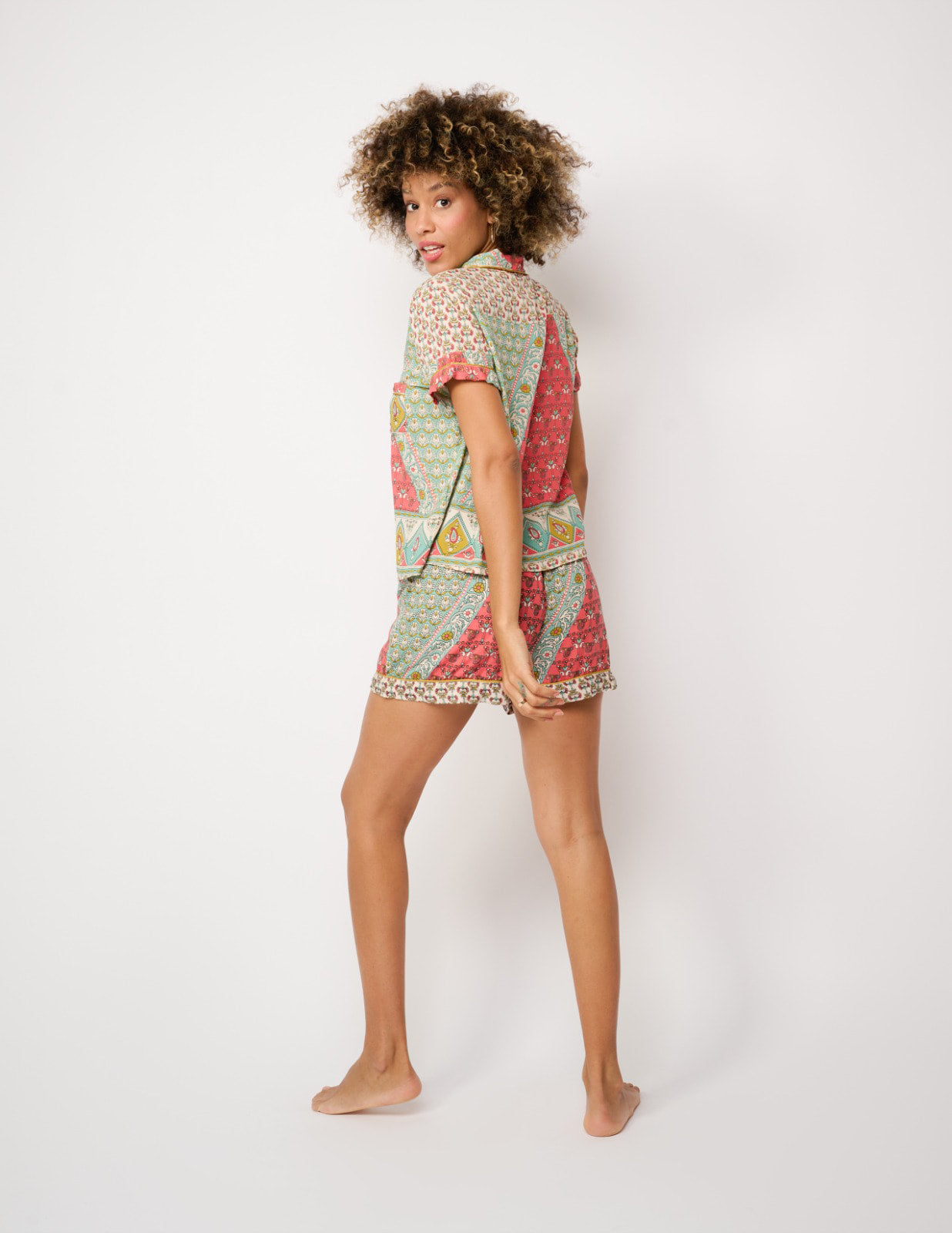 Dream in color with the Breton PJ Set. A soft, lightweight two-piece with a playful patchwork print and relaxed silhouette — perfect for lounging, gifting, or cozy nights in.