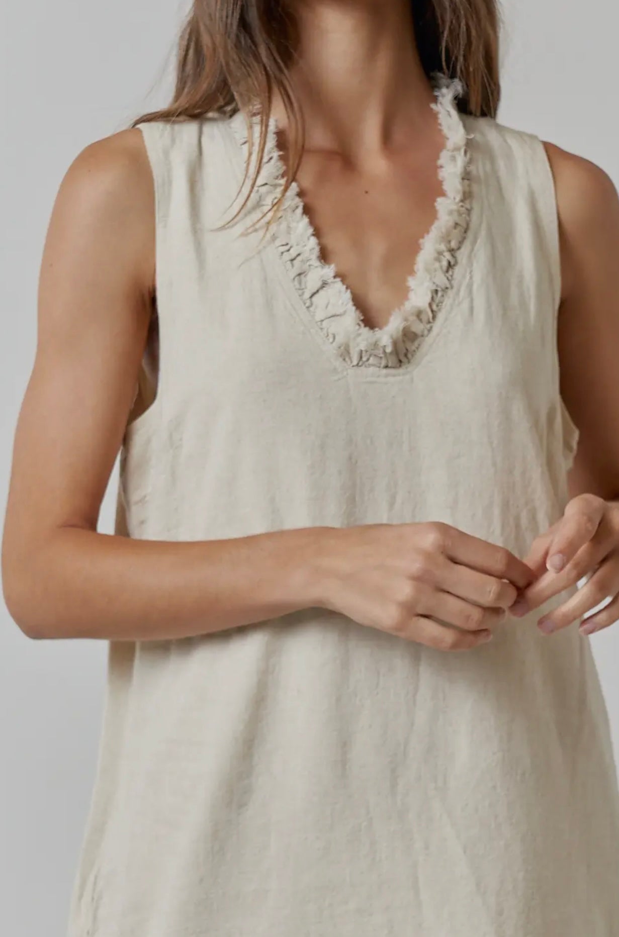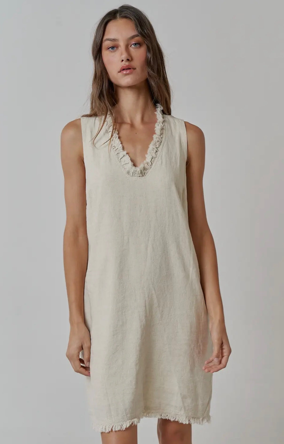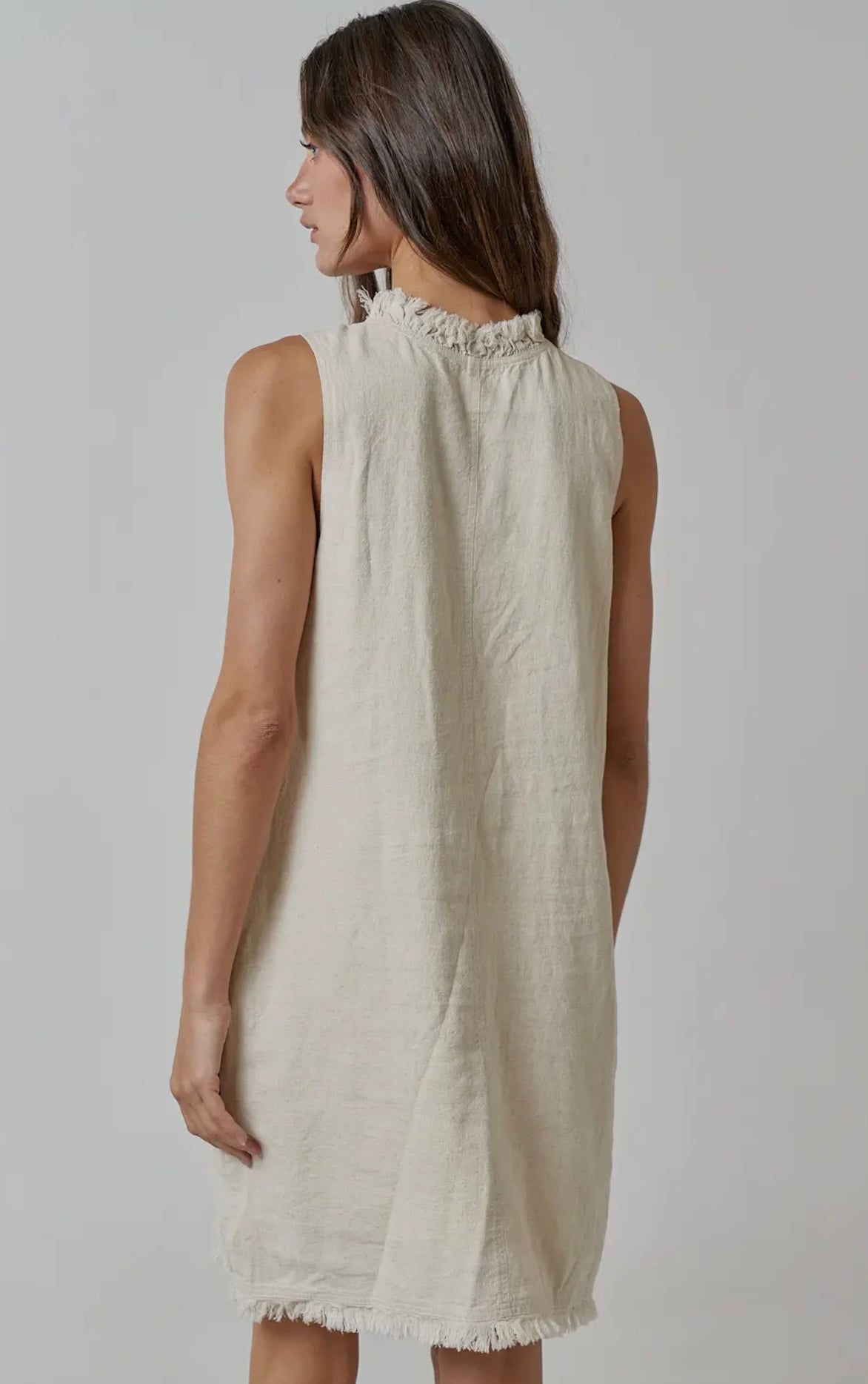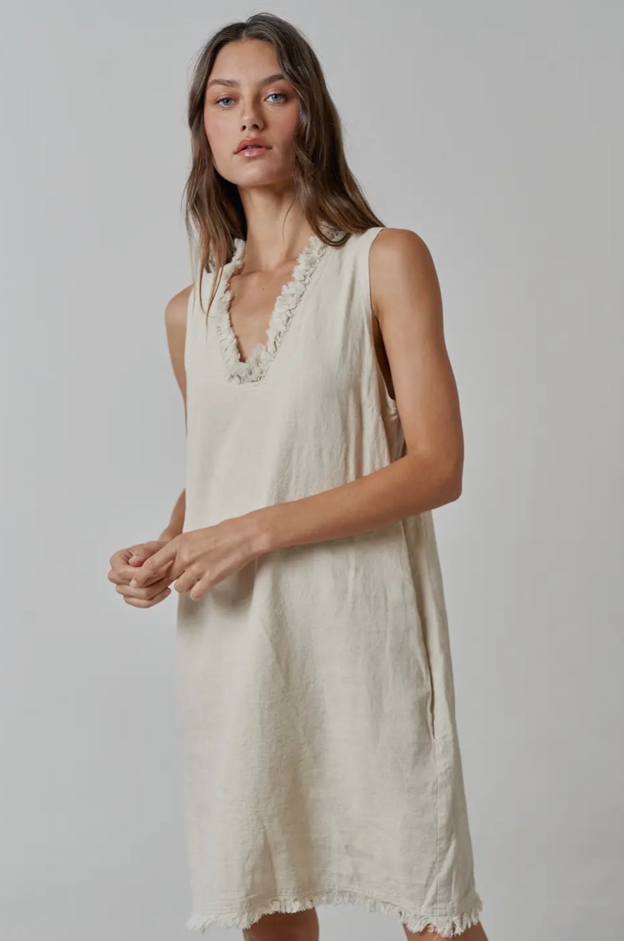 Chic and effortless — the Ezeiza Dress is crafted from soft linen with a relaxed fit, sleeveless cut, and fringed V-neckline. Minimal, natural, and timeless.