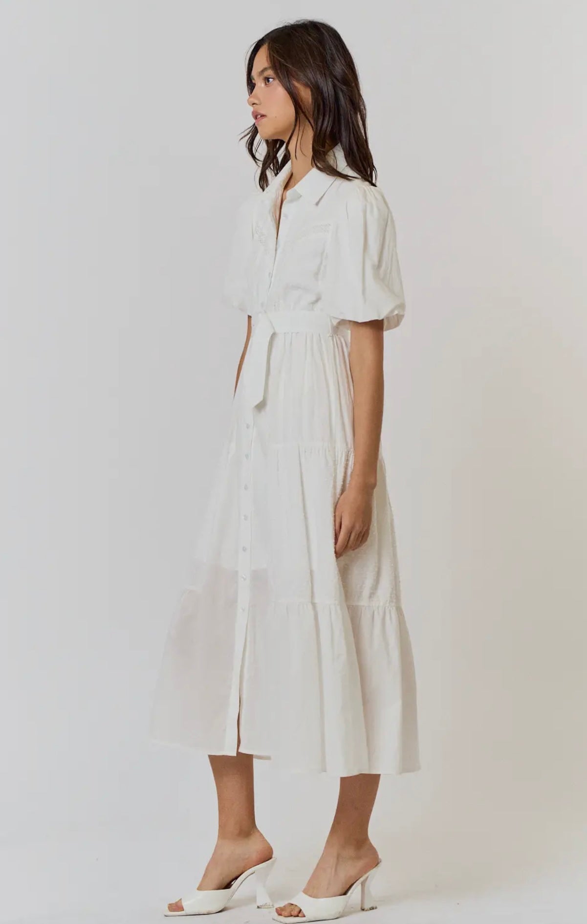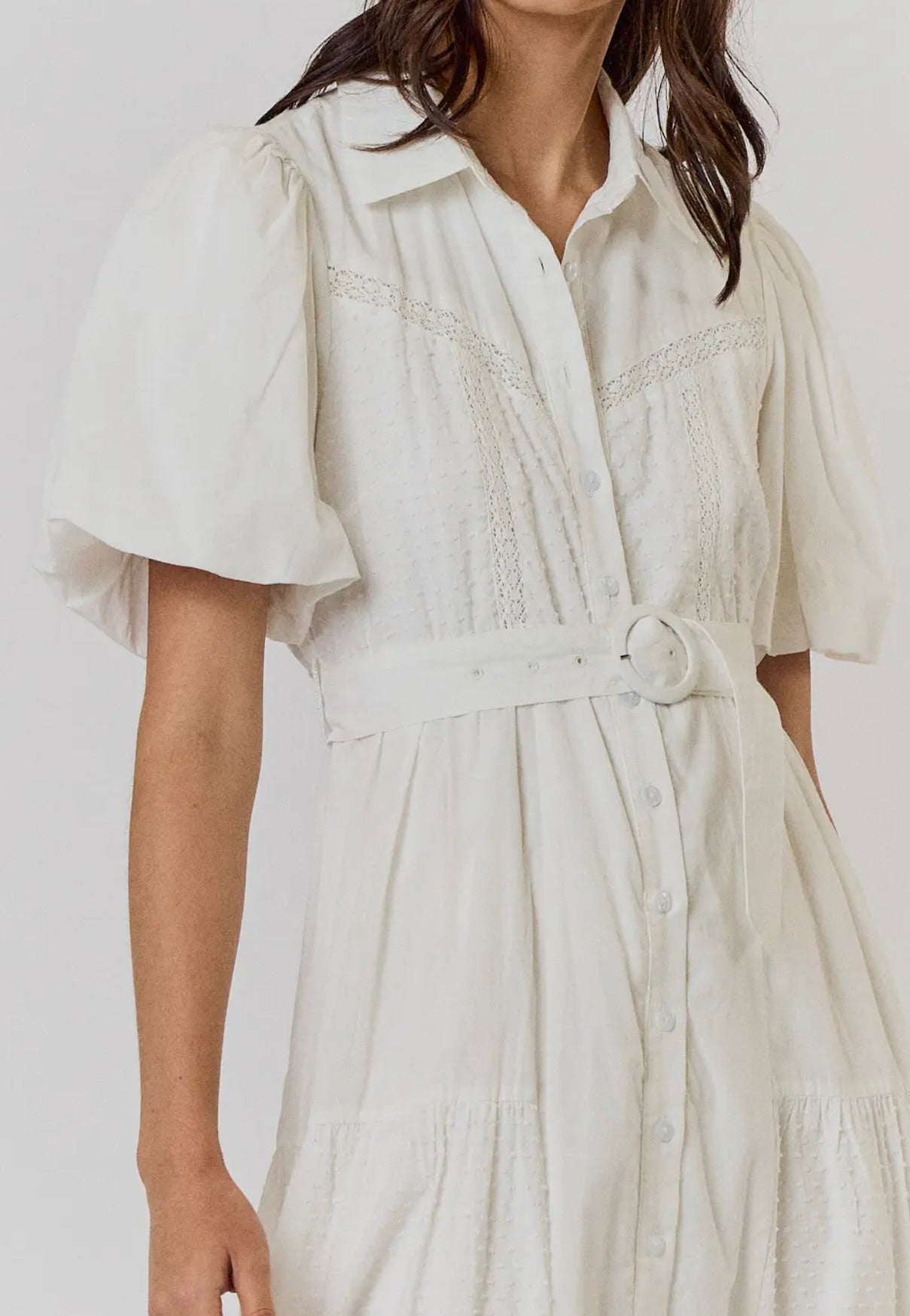 Designed to offer both comfort and style. Featuring a flattering waist tie, button-down front, and delicate short sleeves, this dress is perfect for any warm-weather occasion. Whether you’re attending a garden party or enjoying a casual day out, this dress ensures you look effortlessly chic.