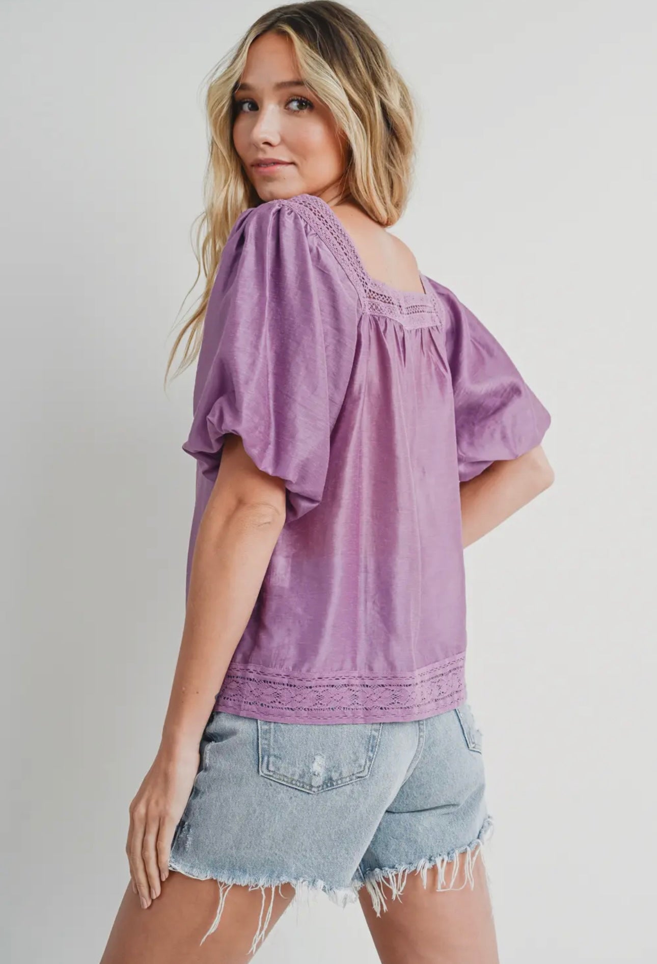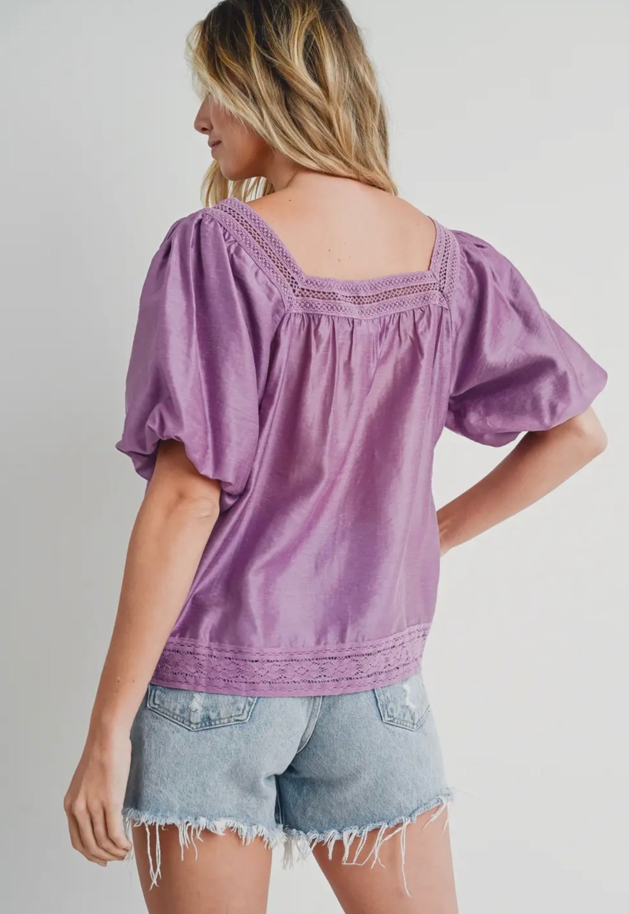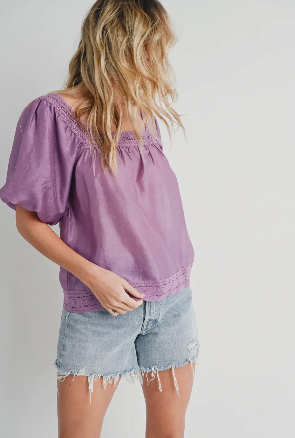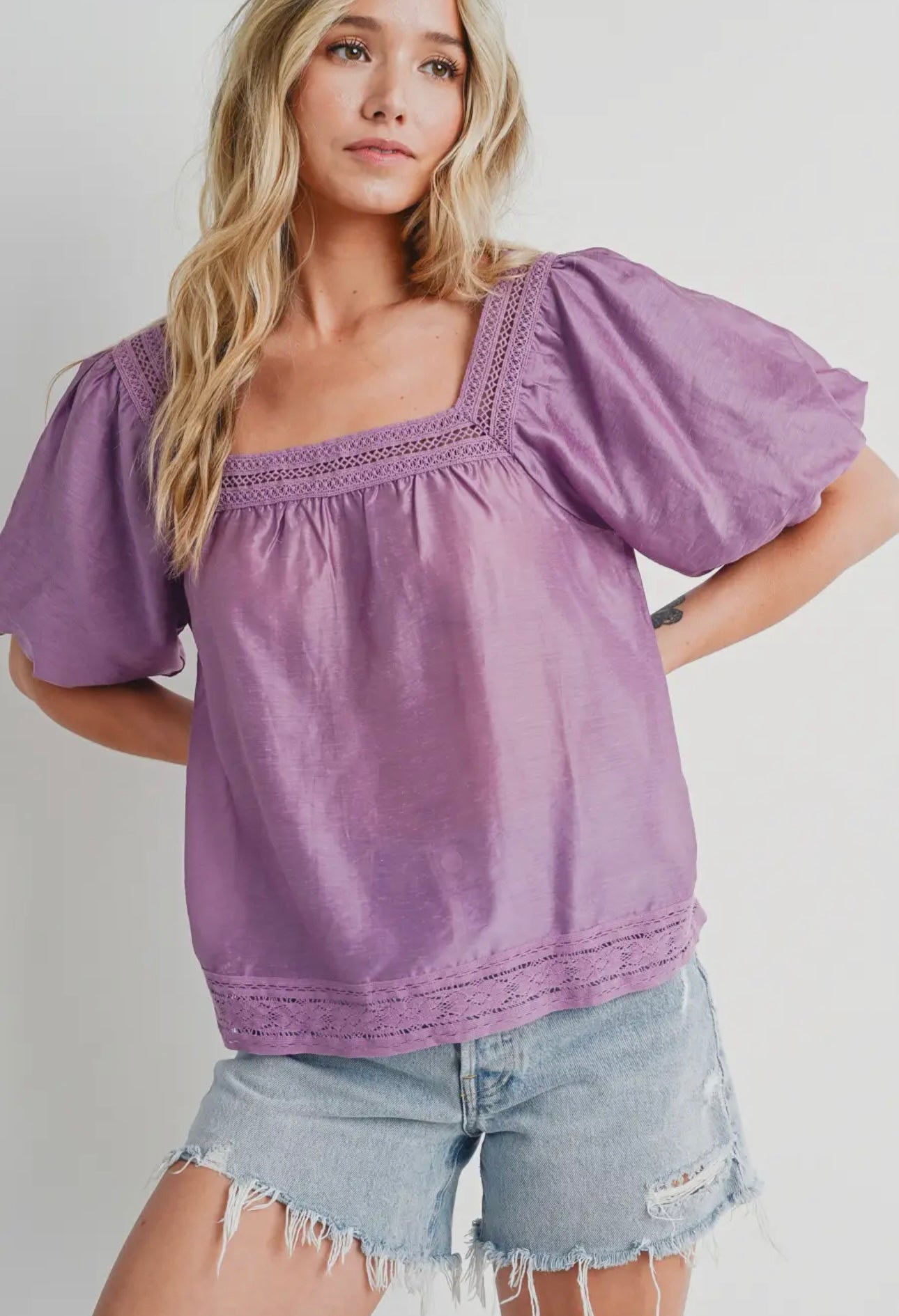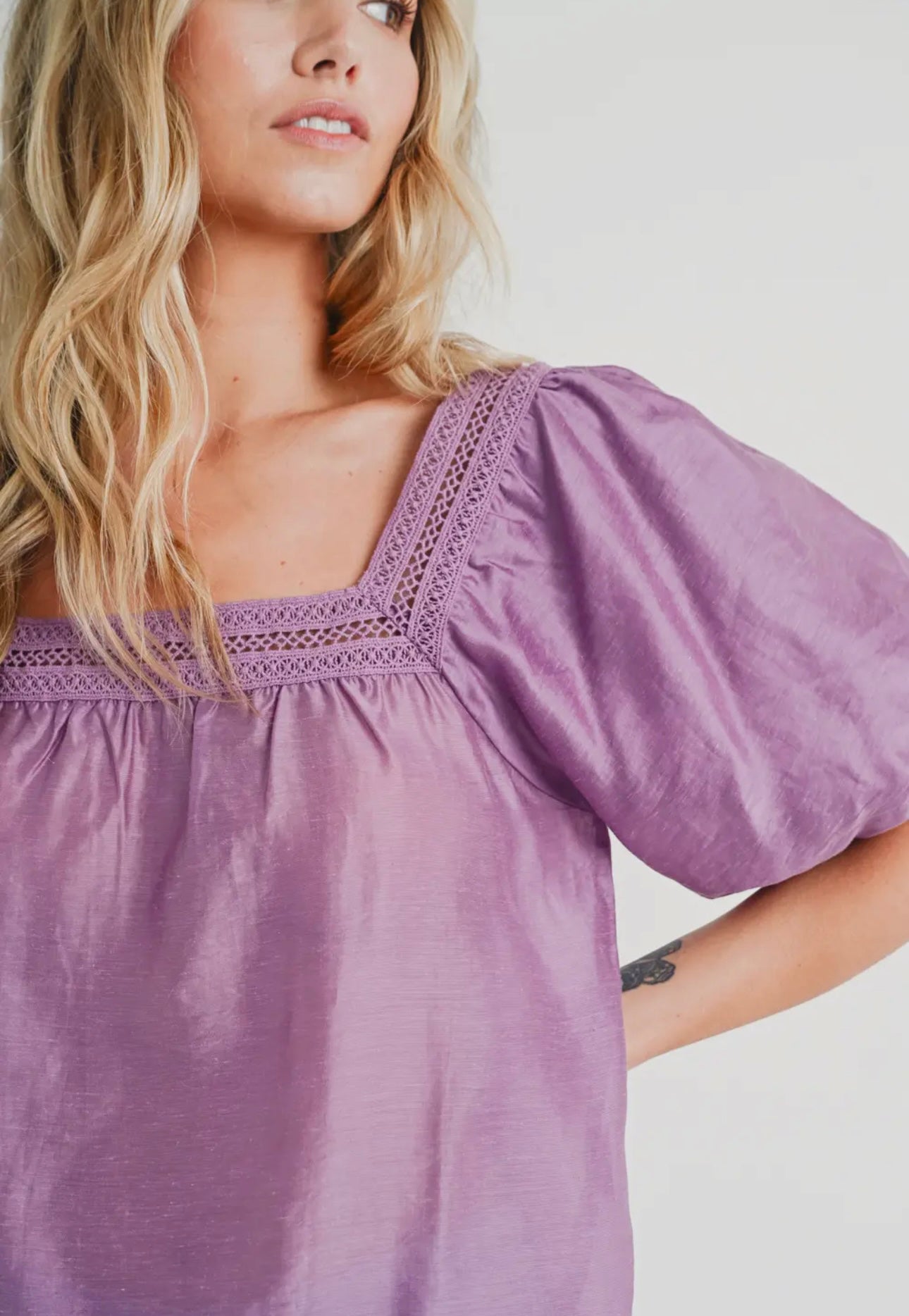 The Nimes Top blends relaxed charm with a feminine touch. Crafted from soft lilac fabric with textured stitching and airy puff sleeves, it’s the effortless piece that pairs beautifully with denim or linen.