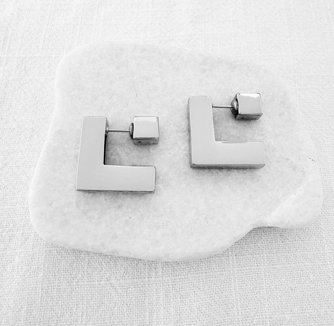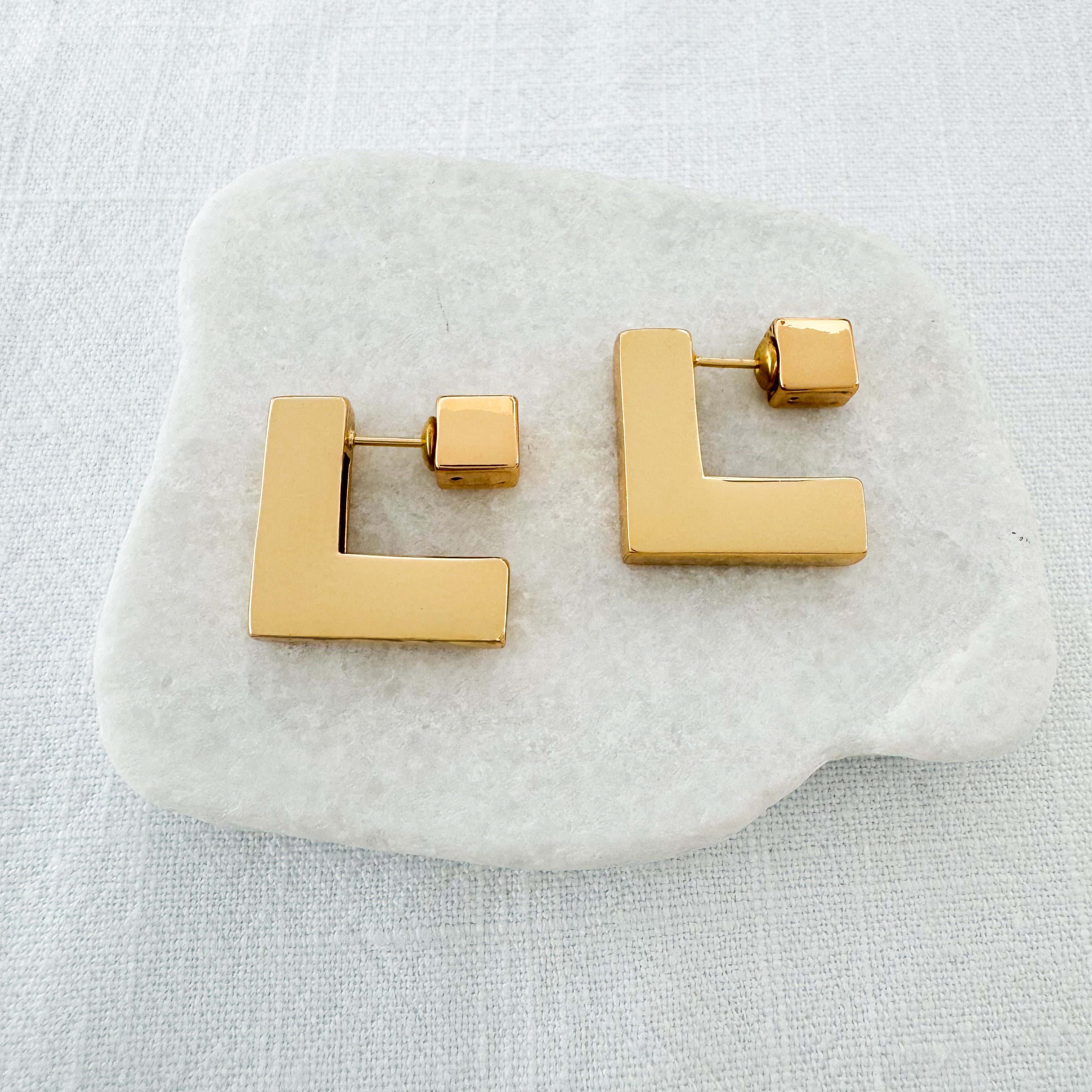 Bold geometry meets clean elegance — the Caterina Stud Earrings feature a square drop design, plated in gold, with a sleek, angular profile. These hypoallergenic and nickel-free earrings combine modern minimalism with statement proportions.
