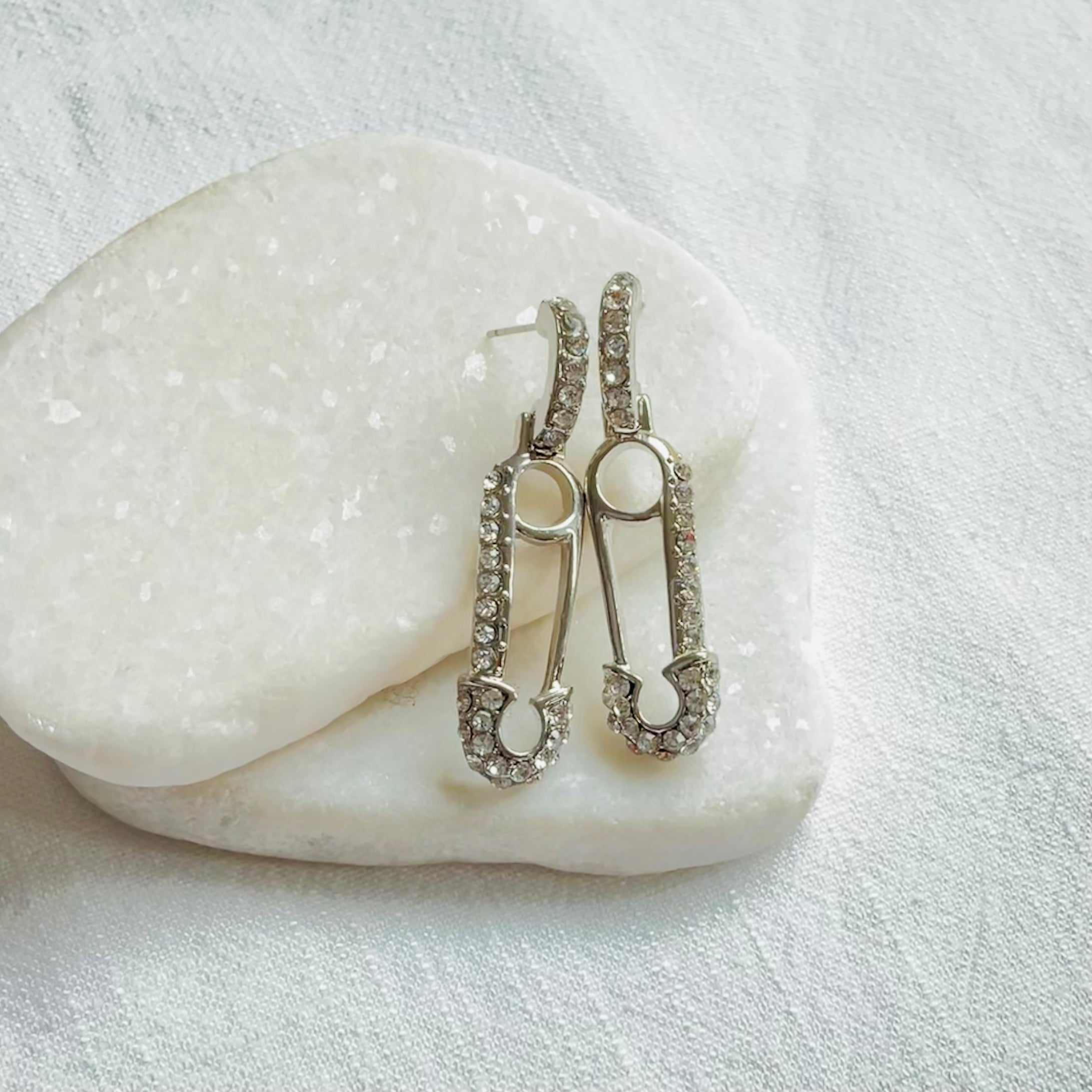 Elongate your look with elegance. These sculptural Pin with Stones studs in silver combine shimmering crystals with a sleek, long silhouette. Hypoallergenic and attention-grabbing—perfect for dressing up your everyday or anchoring your outfit for nights out. Bold design, refined comfort.