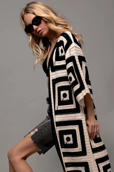 Step into effortless style with our Geo Granny Square Duster Cardigan. Inspired by timeless crochet patterns, this longline open-front cardigan blends bold black-and-cream squares into a modern statement piece. Lightweight yet cozy, it layers beautifully over denim, dresses, or even resort wear. Whether you’re heading out for coffee, a night out, or a weekend getaway, this cardigan transforms any outfit with an editorial edge.