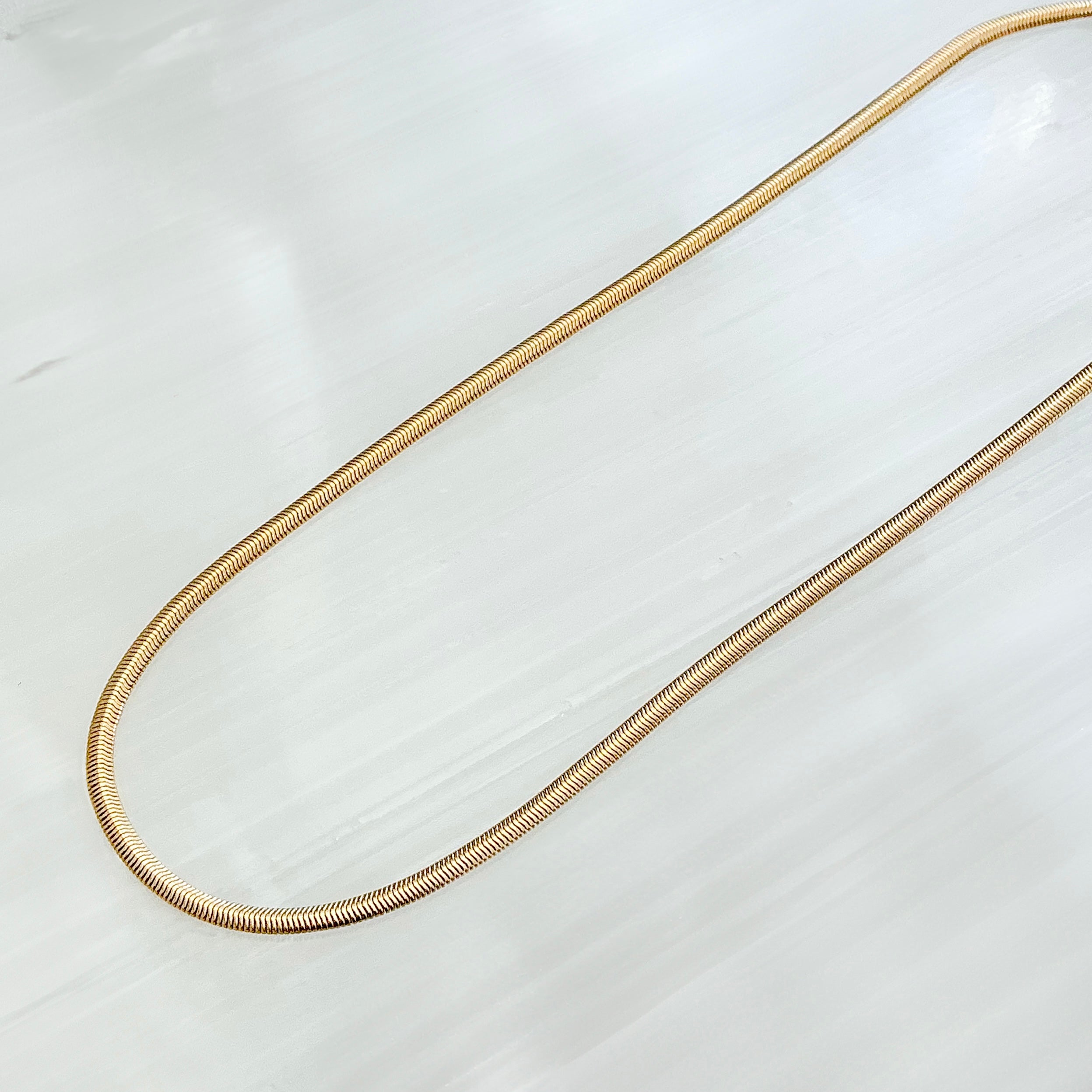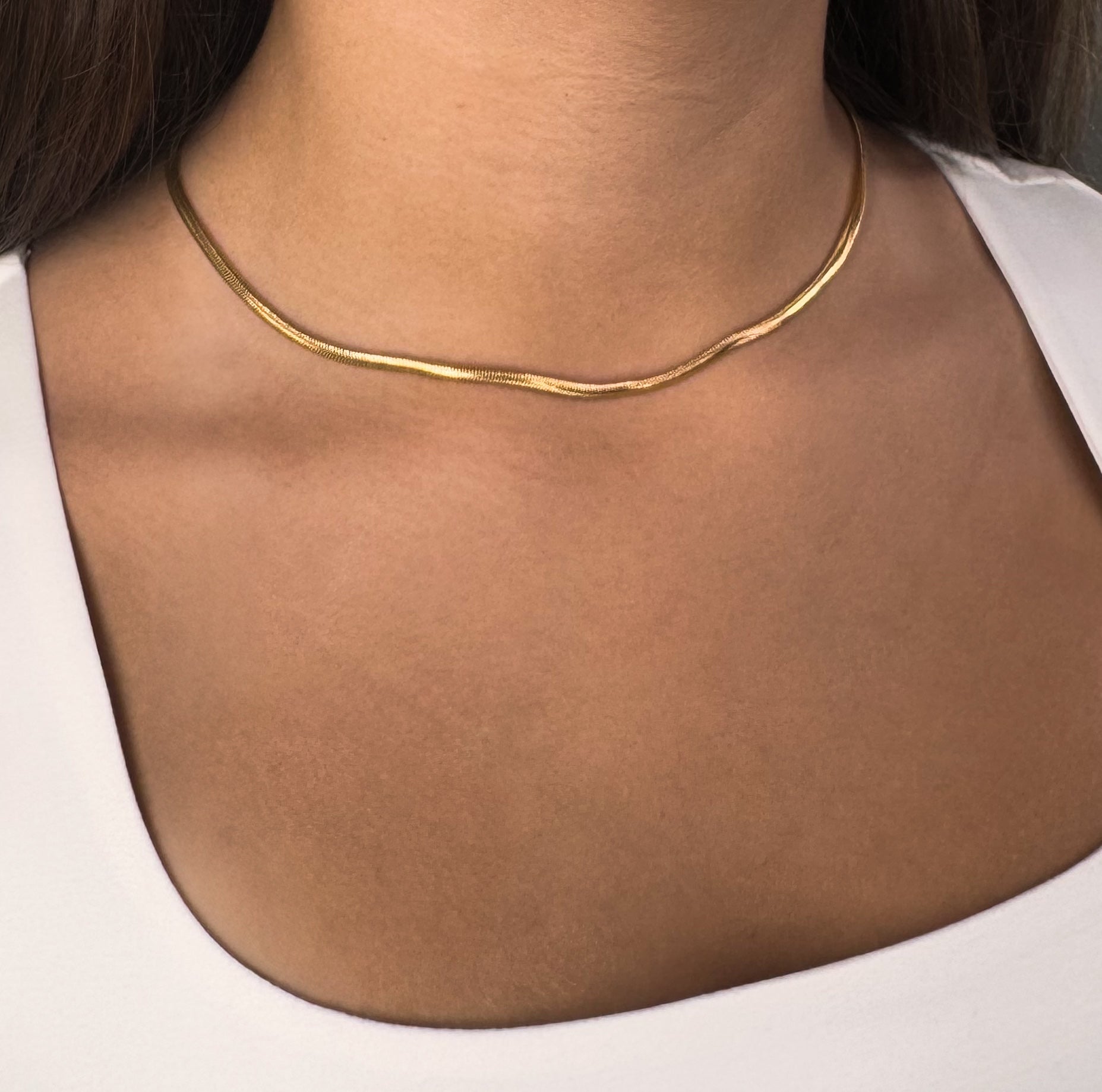 A sleek herringbone chain designed to lay flat with a luminous finish. Perfect worn solo as a statement piece or layered for a modern, chic look.