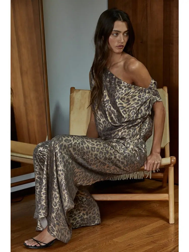 Step into the night with the Sahara Nights Top—a statement piece that blends metallic shimmer with wild sophistication. Designed in a golden leopard print with a draped one-shoulder silhouette, it’s made to turn heads from evening soirées to city nights out. Lightweight yet bold, it pairs effortlessly with wide-leg trousers, sleek denim, or even a matching metallic pant for a full look.