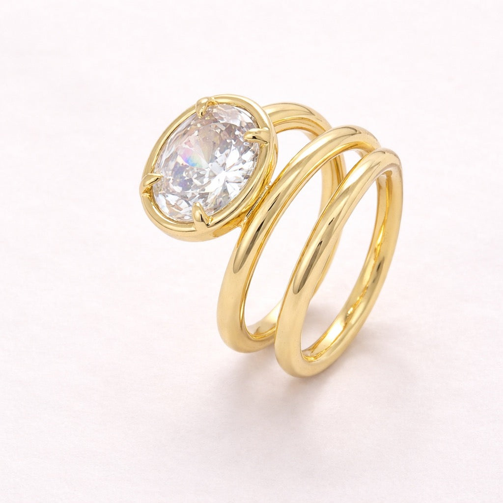 Warm, radiant, and effortlessly bold — this sculptural ring features a luminous oval-cut stone set on sleek, layered gold bands for a modern stacked effect.