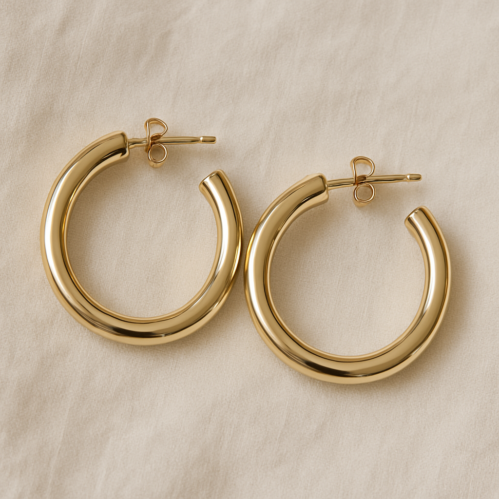 The classic hoop, elevated. These polished gold hoops offer bold shine and timeless simplicity—lightweight, modern, and perfect for everyday or night-out style.