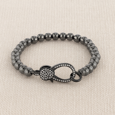 A sleek balance of shine and edge. This hematite bracelet features a pavé crystal clasp and polished beads that catch the light beautifully—perfect for stacking or standing out on its own.