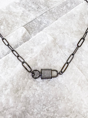 The Binn Necklace features a bold black enamel chain finished with a geometric crystal lock — a standout detail that adds edge to your look.