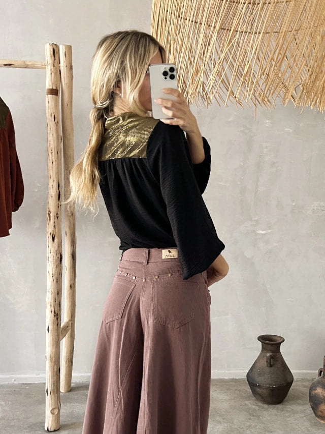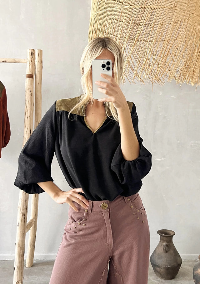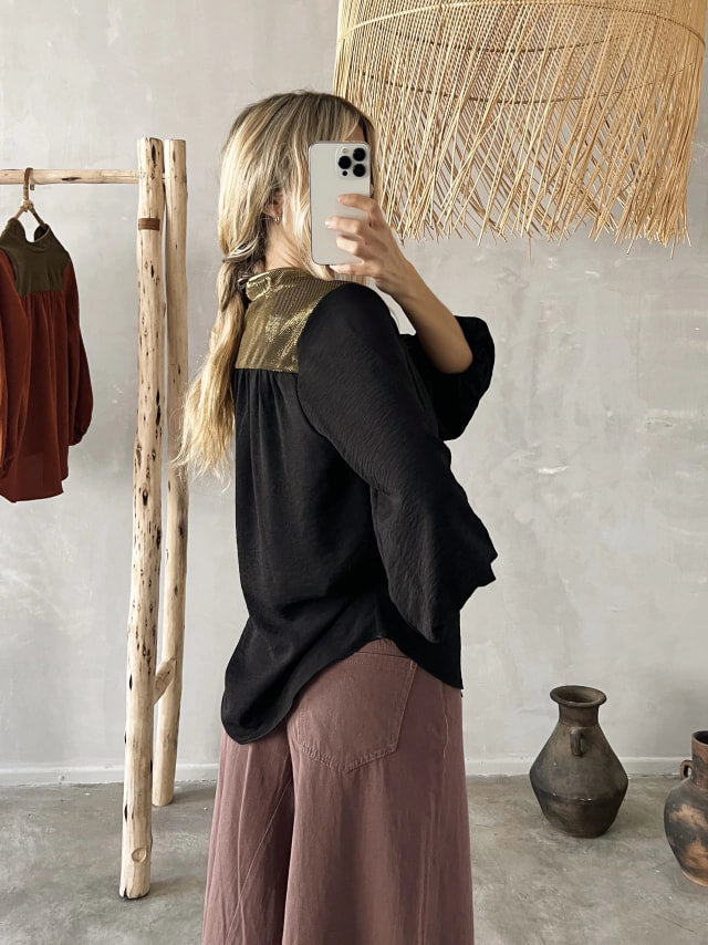 Mega loose & comfortable silk crepe and organza blouse. It is one size but it covers all sizes as it is loose. You can wear it tucked in or totally loose.