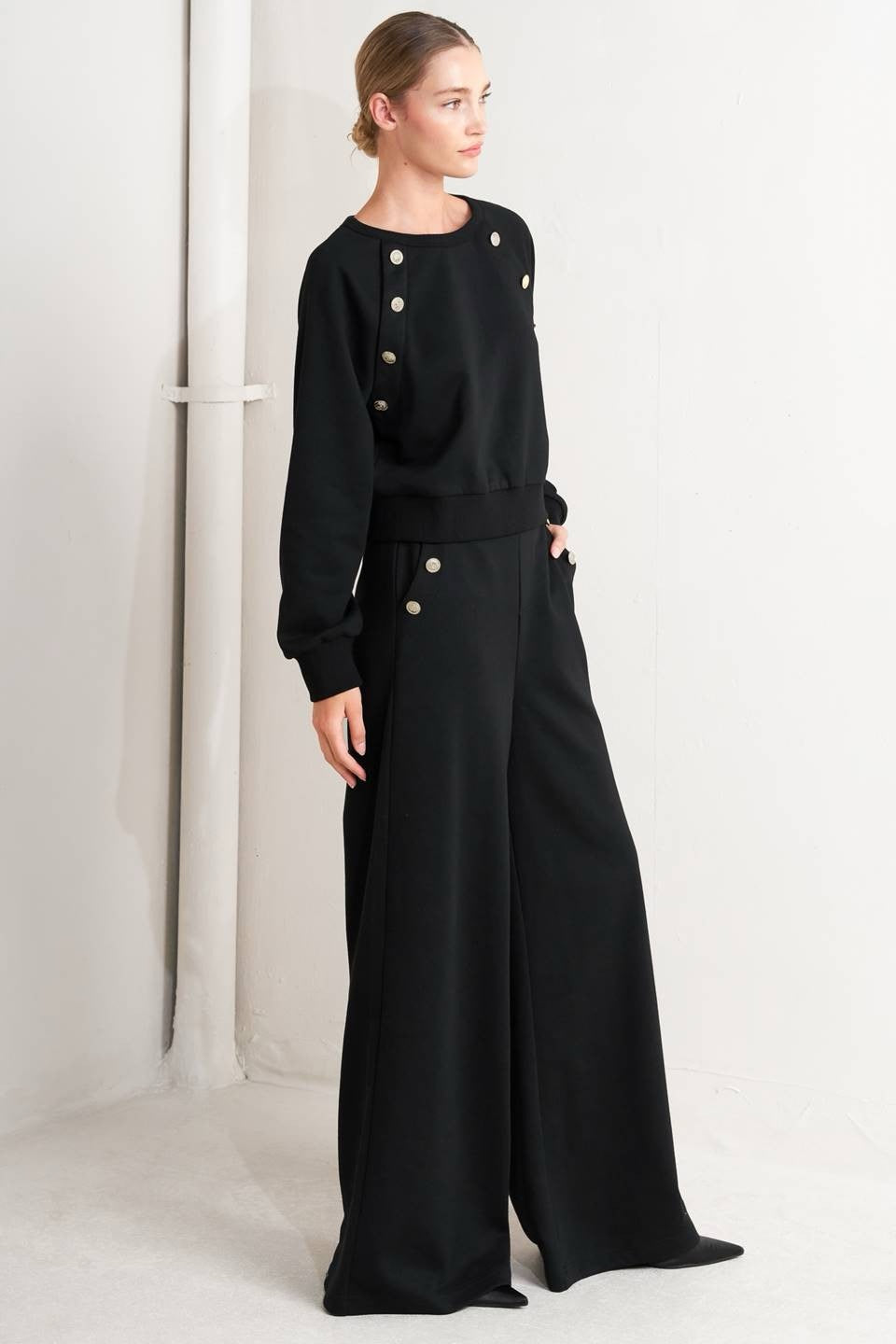Sophisticated and chic, the Carmen Buttoned Pants feature a wide-leg silhouette with gold button accents for timeless elegance. Designed in classic black with a flattering high-rise fit, they are perfect for transitioning from polished daytime looks to elevated evenings.