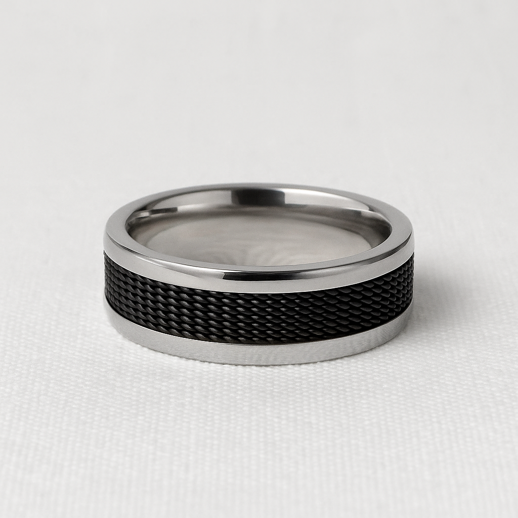 Minimalist and bold, the Pren Ring combines polished silver with a matte black textured band for a refined edge. Crafted in stainless steel, it’s the perfect everyday piece for those who love clean lines and understated style.