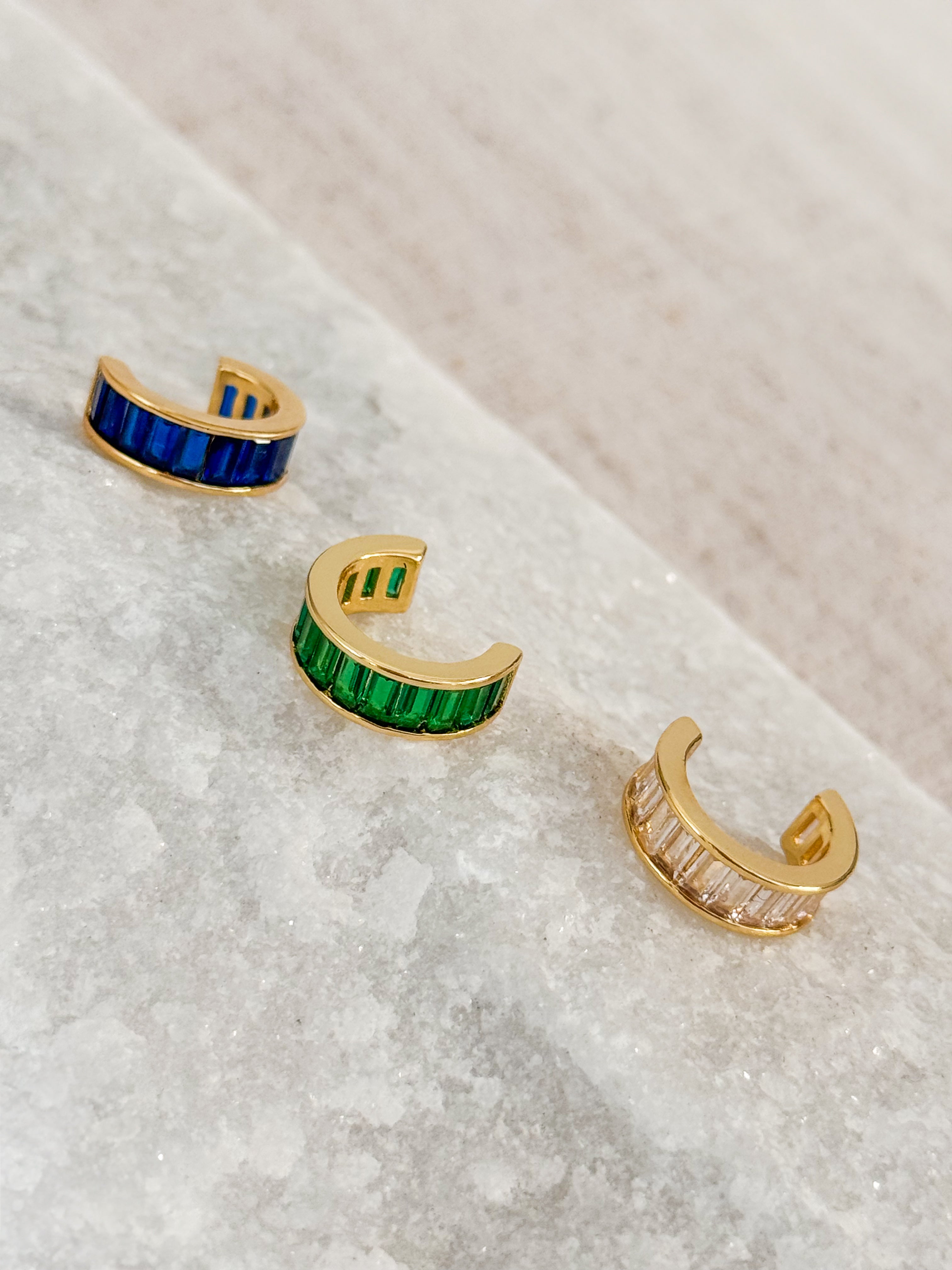 Radiant and refined. The Seraphim Ear Cuff is a gold-plated, nickel-free cuff accented with a sparkling stone in clear, green, or blue. No piercing required—an easy way to add color and shine to your ear stack.