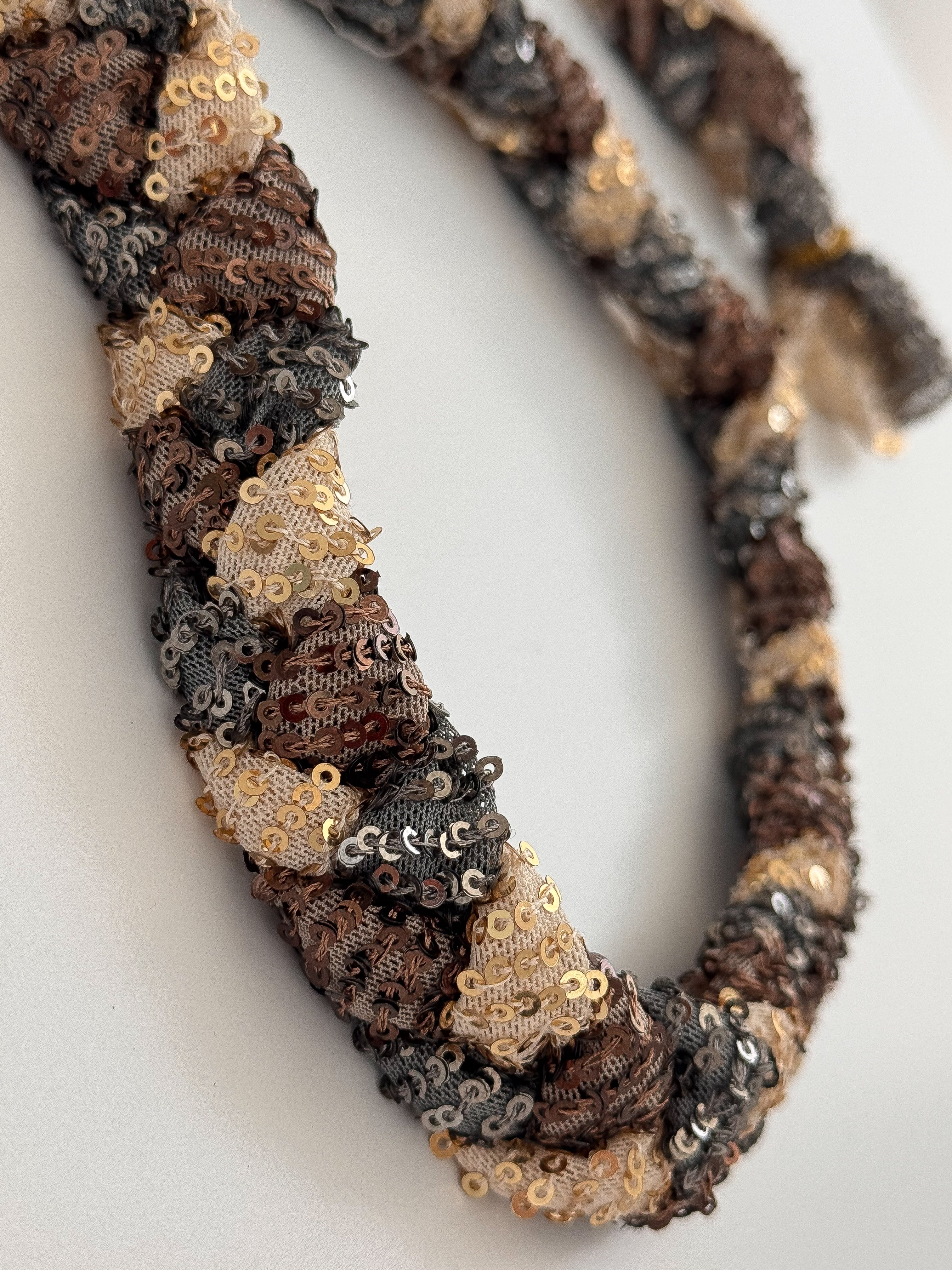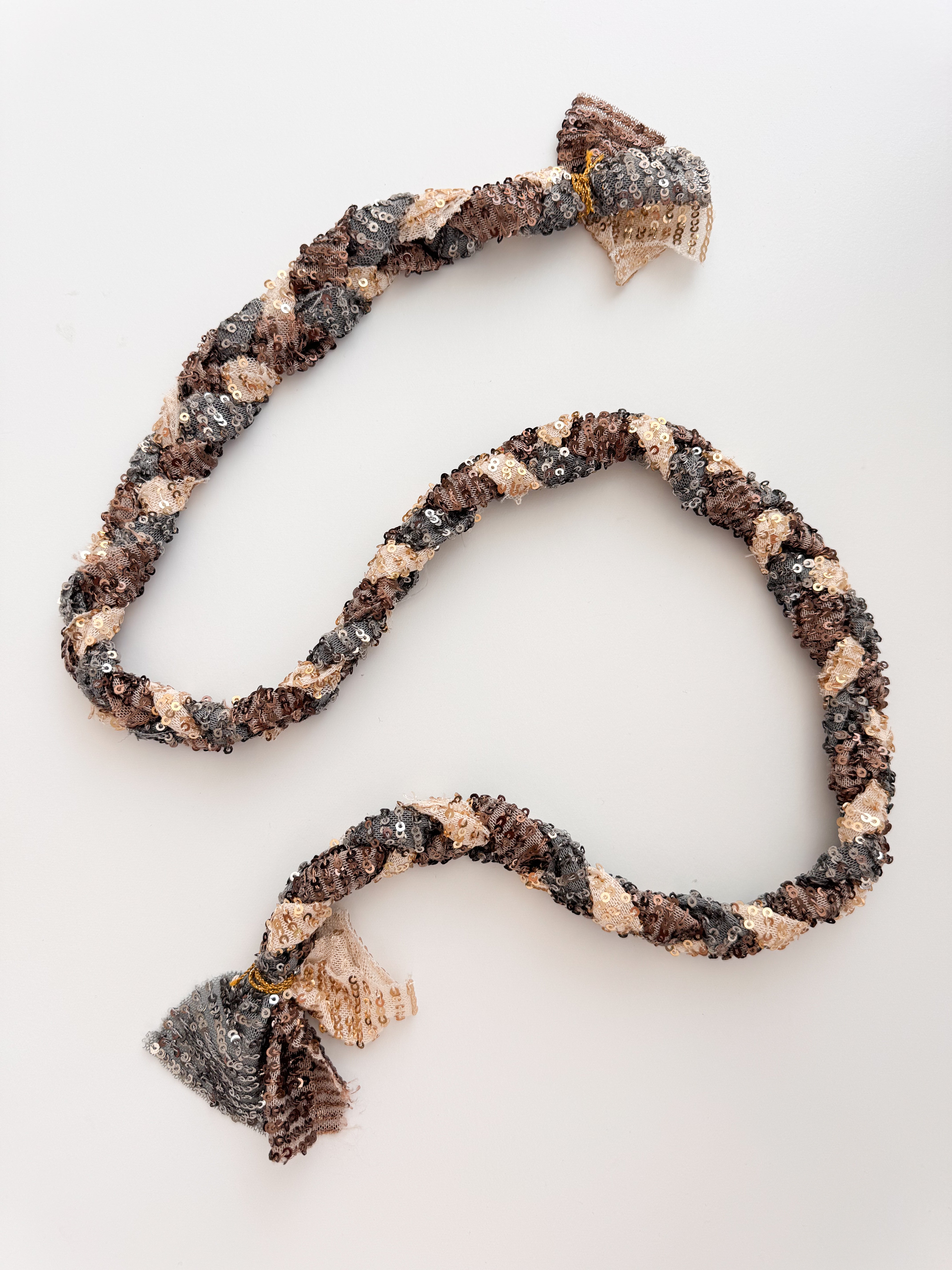 The Twilight Sequin Rope Belt is a hand-braided statement piece adorned with sequins in golden, bronze, and charcoal tones. Lightweight yet bold, it adds a radiant finish to evening outfits or a chic sparkle to daytime looks. Wear it long, doubled, or knotted for versatile styling.